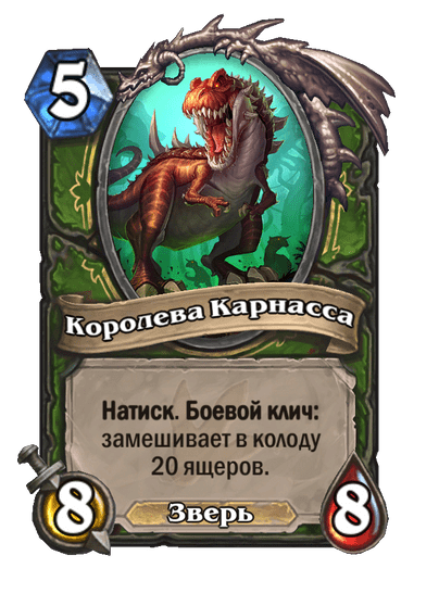 Королева Карнасса (награда за Королеву болот) Натиск. Боевой клич: замешивает в колоду 20 ящеров.