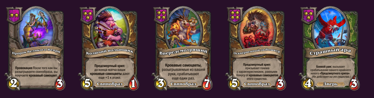 На старте ищем Колючего вольщика. Чтобы стратегия работала эффективно, нужно разгонять статы кровавых самоцветов — в этом также помогут Ночной джазист и Рилак-металлист. После улучшения начинаем активно качать Осквернённого дебошира; Страшная ара дополнительно будет вызывать срабатывание нашего предсмертного хрипа. Стратегия не переходит на 5-й уровень из-за отсутствия требуемых там существ. В лобби зверей стратегия дважды эффективна.