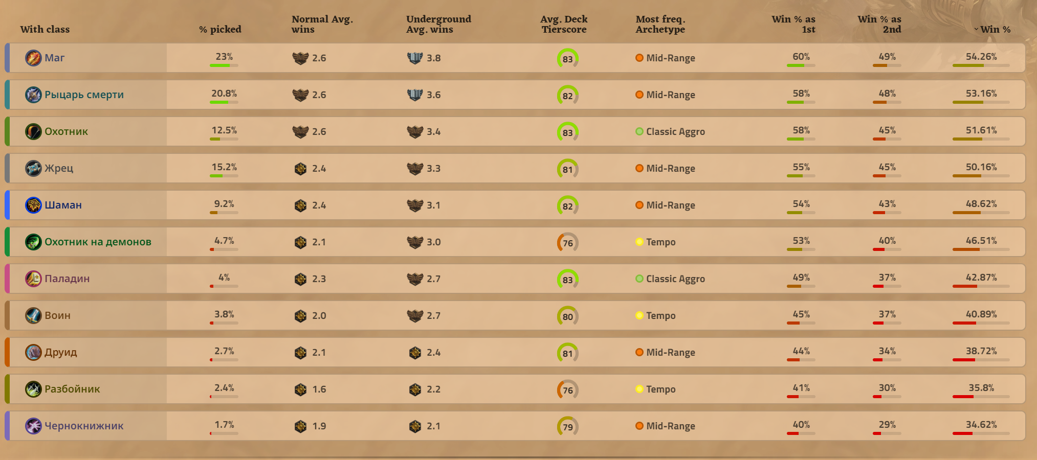 Арена недалеко ушла от стандарта по тенденциям меты: недавнее удаление сильнейшей легендарной карты мага не смогло пошатнуть трон Джайны. Рыцарь Смерти и Охотник по-прежнему дышат Магу в спину, показывая отличную статистику и сильный пул карт в актуальной ротации Арены.