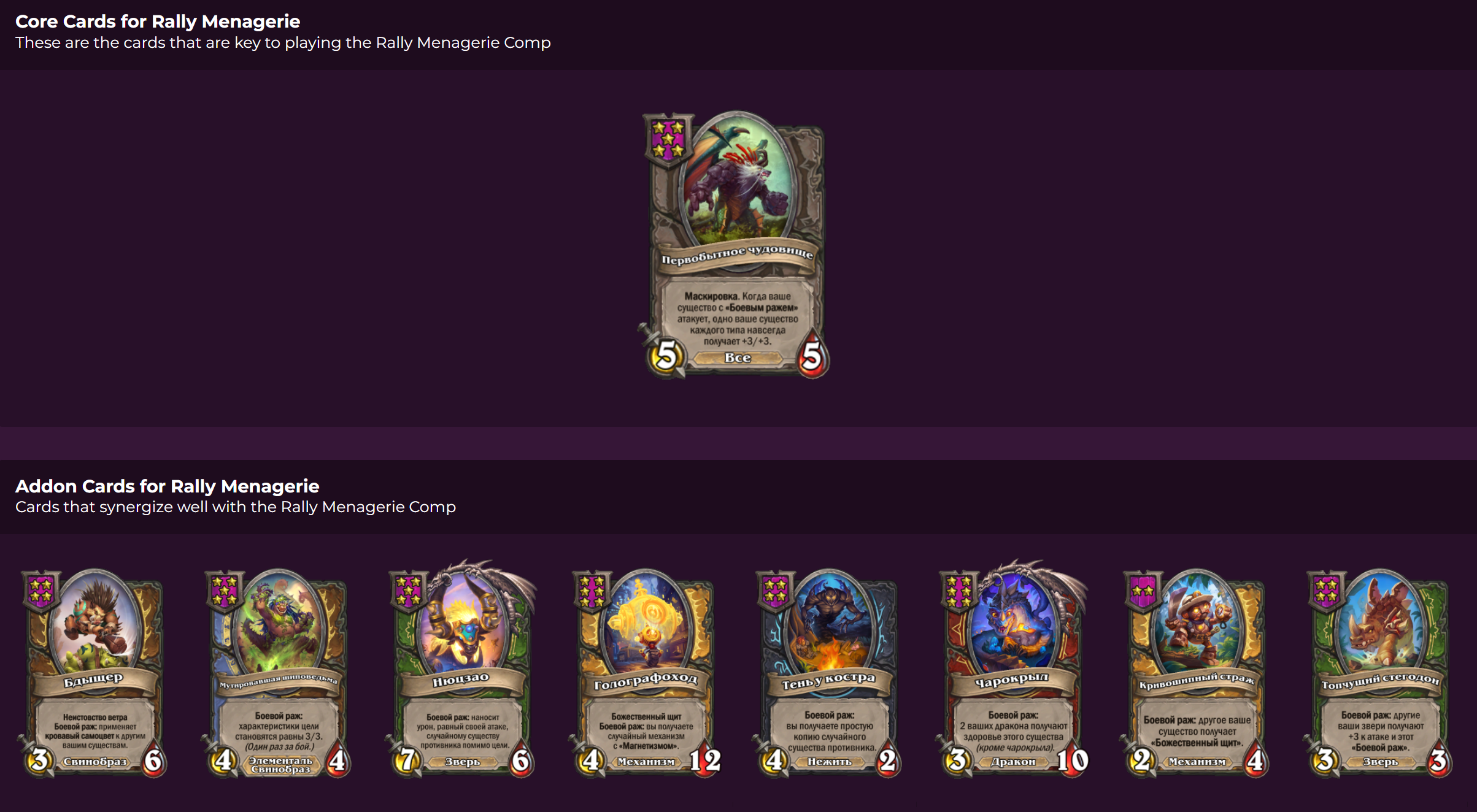 Неожиданно, но после балансного патча и изменений режима одной из лучших стратегий стала композиция, которая строится вокруг Первообытного Чудовища и существ разных типов (свинобразов, элементалей, зверей, механизмов, нежити, драконов, наг). Выше вы можете посмотреть одни из лучших существ для этой стратегии.