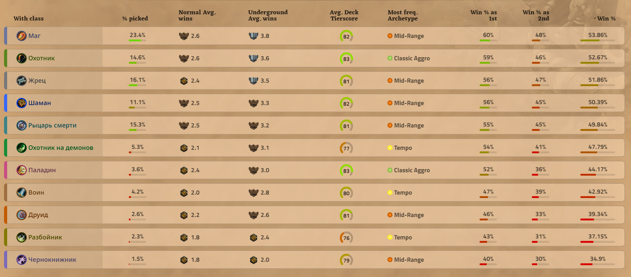 Арена по тенденциям меты далеко не ушла от Стандарта: недавнее удаление сильнейшей легендарной карты Мага не смогло пошатнуть трон Джайны. Рыцарь Смерти просел на две позиции, а Охотник укрепил свои результаты и по-прежнему дышит Магу в спину, демонстрируя отличную статистику и сильный пул карт в текущей ротации. Также неожиданно Жрец поднялся на подиум, но на обычной Арене Шаман всё же выглядит предпочтительнее.