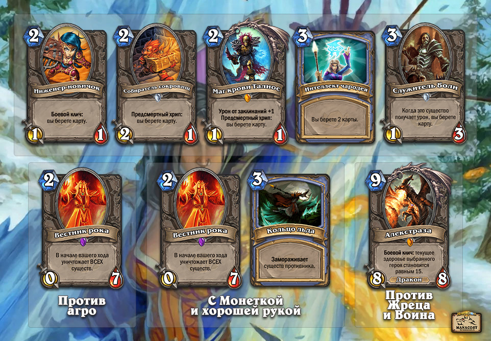 В последнее время все чаще стали использоваться Зеркальные копии, которые очень помогают в затягивании партий и хорошо работают с добором за счет своей низкой стоимости. Карту часто берут в одной копии, чтобы не жертвовать одним Инженером-новичком — вы можете осуществить эту замену по желанию. Тут же есть и Верховный маг Антонидас — тяжелый способ победы для матч-апов с Воинами и Жрецами.