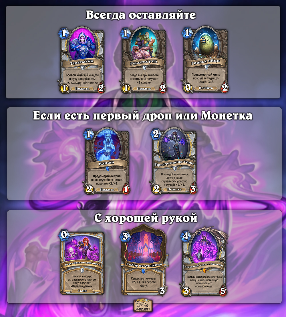 Оставляйте Бессмертных союзников, если в руке есть пара хороших первых дропов. Банши нужна всегда с Монеткой или как часть второго хода вместе с другим первым дропом.