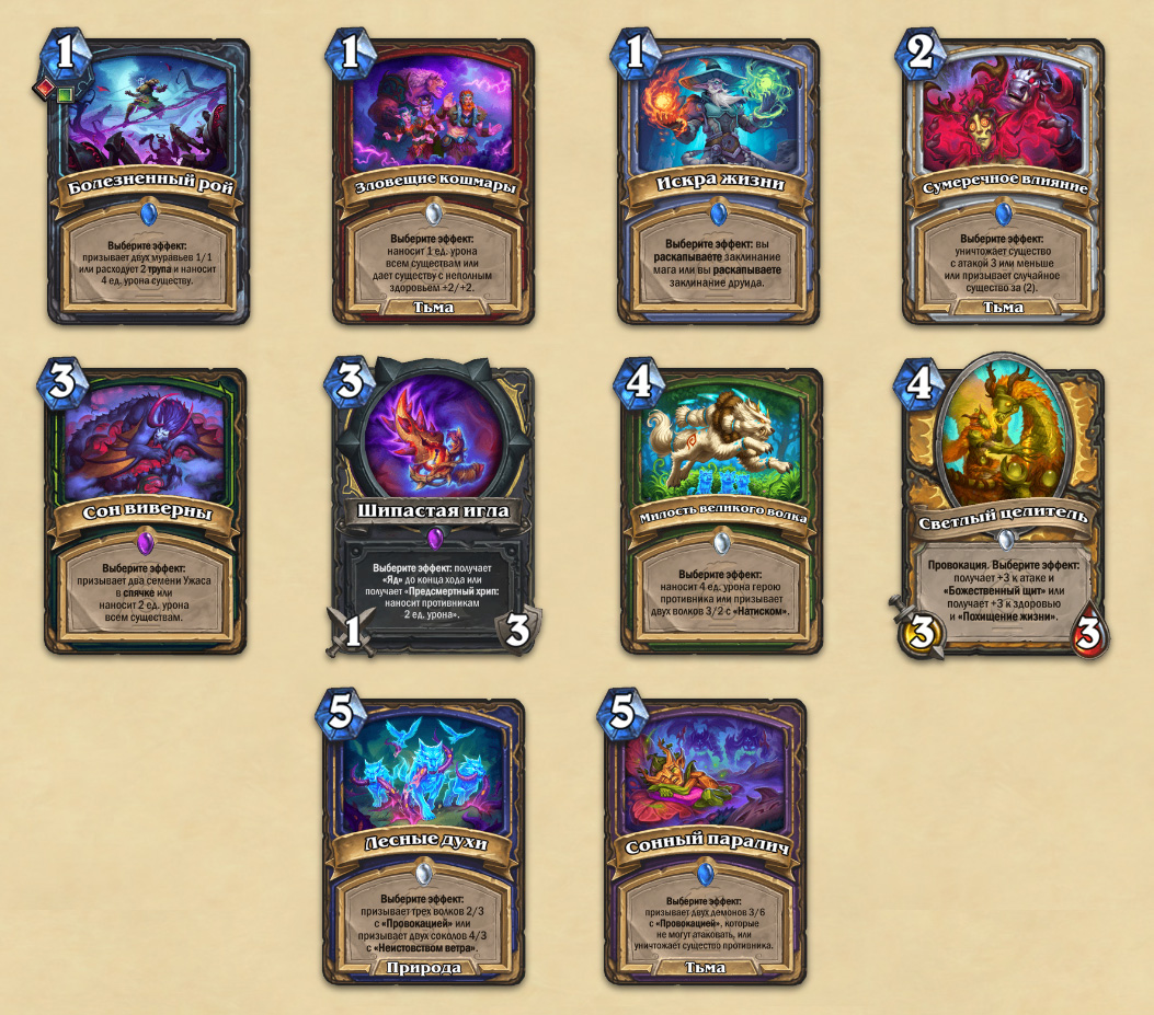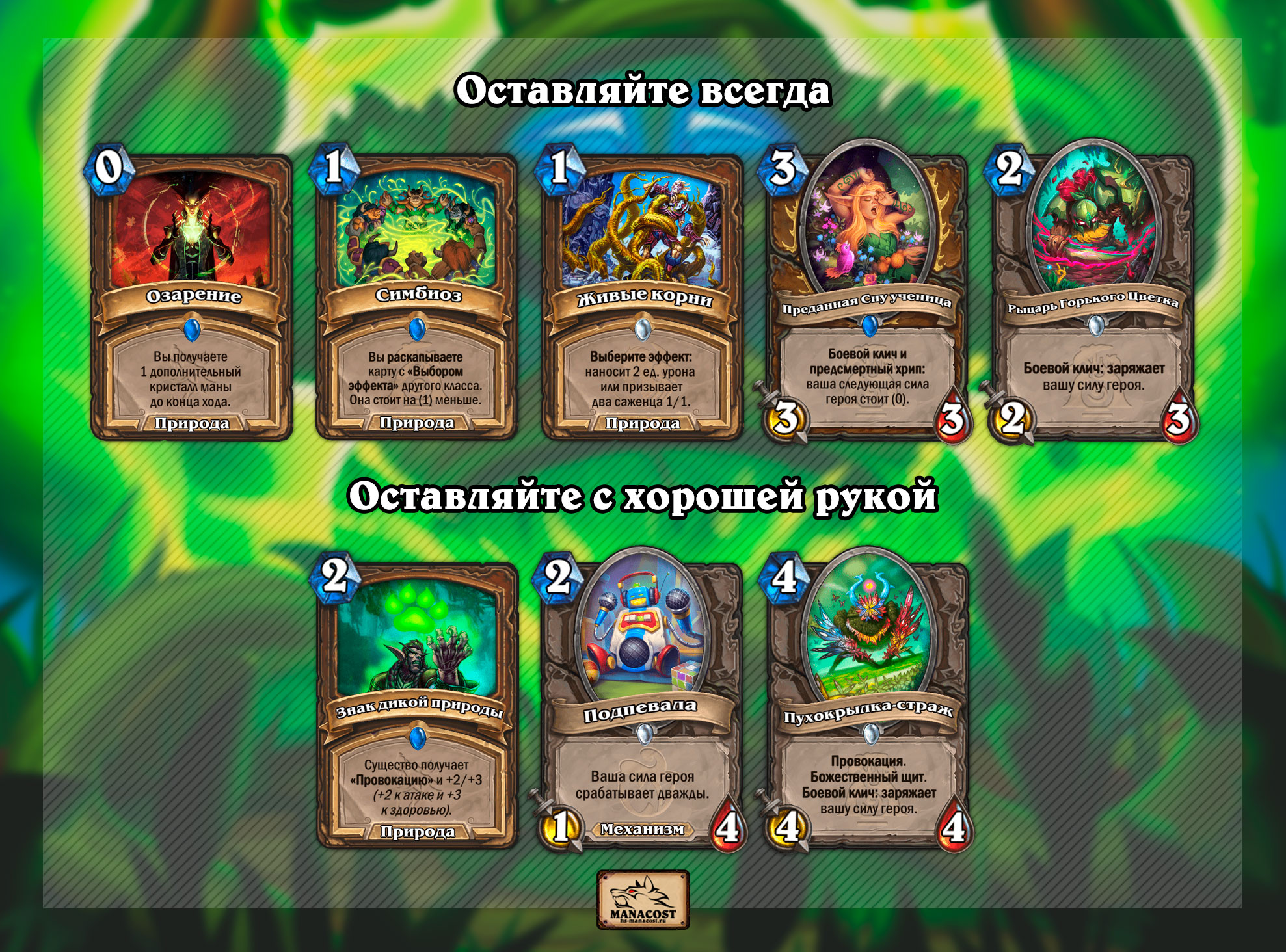 Самые лучшие карты на старте партии — это Симбиоз и Озарение. С ними вы сможете выстроить идеальную кривую маны. Симбиоз отличается не только своей гибкостью (после баффа в патче 32.0.3), но и не самым плохим пулом карт. Болезненный рой и Сон виверны — универсальные сильные карты. Искра жизни сильна из-за лишнего вклада в зарядку (иногда забавно раскапывать Симбиоз и Искру друг из друга). Милость великого волка и Лесные духи хоть и не самые сильные карты, но их выгодно выставить на 1-2 хода раньше их стоимости.