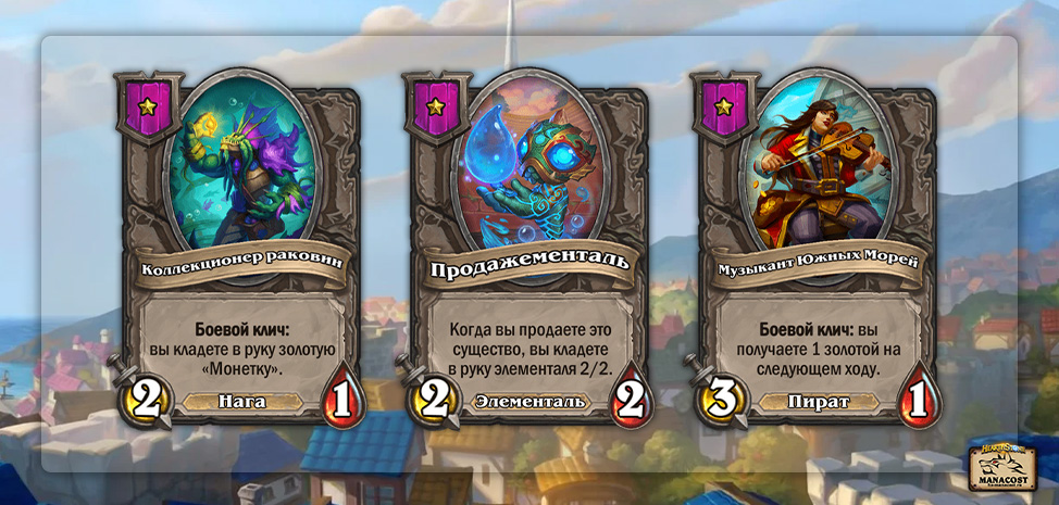 Ход с 3 монетами — старайтесь купить двух существ. В этом помогут Продажементаль или Коллекционер раковин — все они тут же дадут одну монету для покупки второго существа. Если этих существ нет, берите любой боевой клич или Загорающего свинобраза, играйте его, продавайте и покупайте новое существо с хорошими характеристиками.