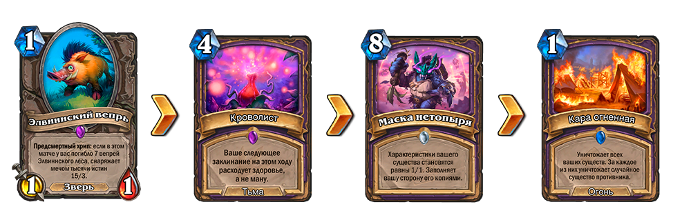 Реализация выглядит следующим образом: на пустой стол ставим Вепря, затем через Кровоцвет разыгрываем Маску нетопыря, расходуя здоровье вместо маны. Это заполняет стол существами, после чего мы уничтожаем их Карой огненной, попутно зачищая доску противника. В результате мы получаем Меч Тысячи Истин, который разрушает кристаллы маны оппонента.