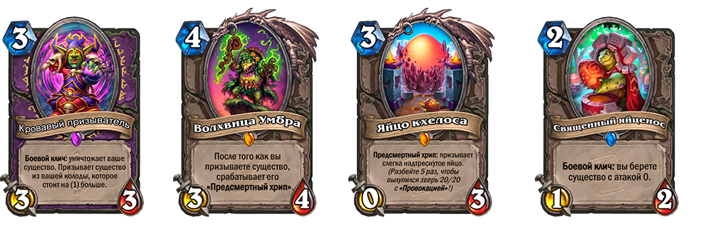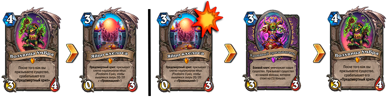 - Не жадничайте с Яйцом Кхелоса. Не старайтесь разыграть комбинацию в один ход с выставлением Яйца, даже если рискуете получить немоту. Откладывая комбо до 6-го хода, вы даёте противнику слишком много времени. Выставляйте Яйцо как можно раньше — в идеале, чтобы использовать на него Кровавого призывателя уже на следующий ход.