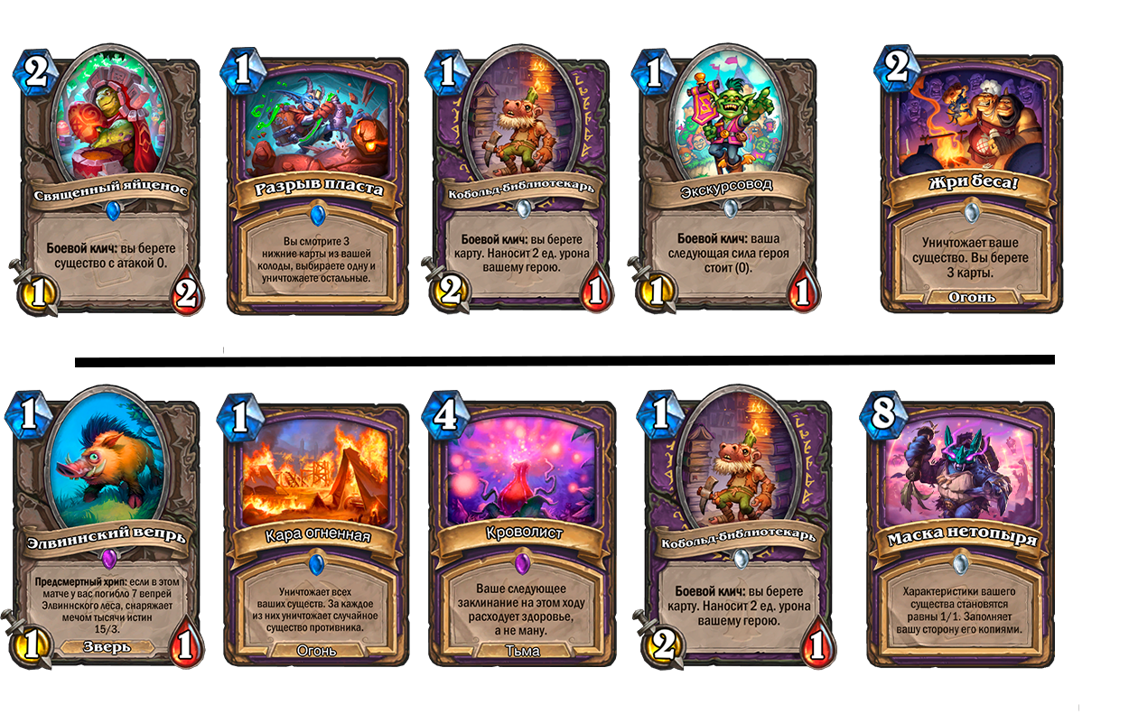 Подводя итог: данный архетип учит грамотно перебирать колоду и дает пространство для выбора условий победы в зависимости от соперника. Кроме того, скрафтив эту основу, вы сможете в будущем попробовать другие сборки: Чернокнижника на больших демонах, версию на 30 карт с Яйцом (аналог текущей, но более уязвимый к агрессии) или «чистого» Вепрь Лока на 30 карт, заточенного на максимально быструю комбинацию.