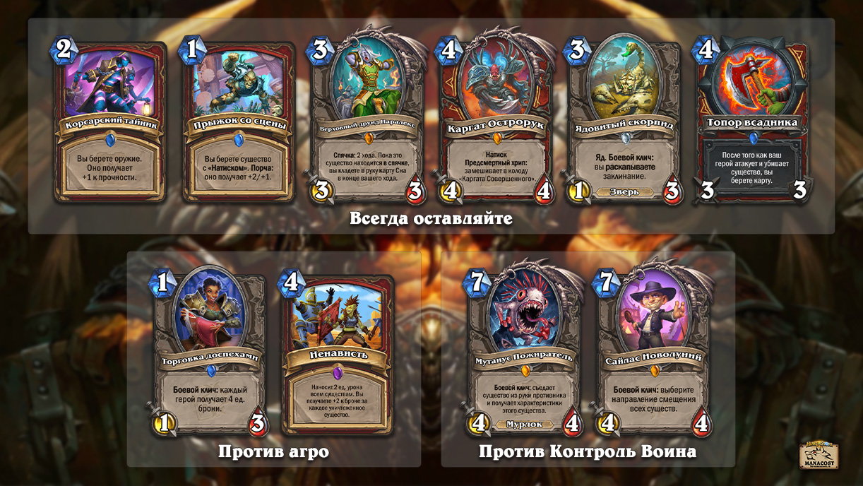 Всегда хорошими картами на старте для вас станут Корсарский тайник, Прыжок со сцены, Верховный друид Наралекс, Каргат Острорук, Ядовитый скорпид и одна копия Топора всадника. Все эти карты пригодятся в начале игры и помогут вам подготовиться к последующим ходам, снабдив необходимыми ресурсами.