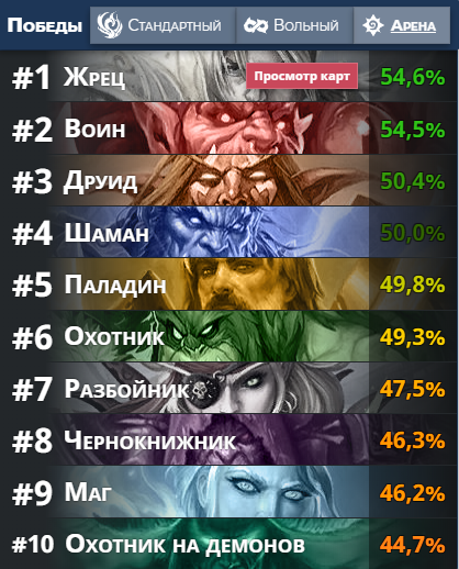 Согласно статистике с HSreplay классовые винрейты на данный момент выглядят так: