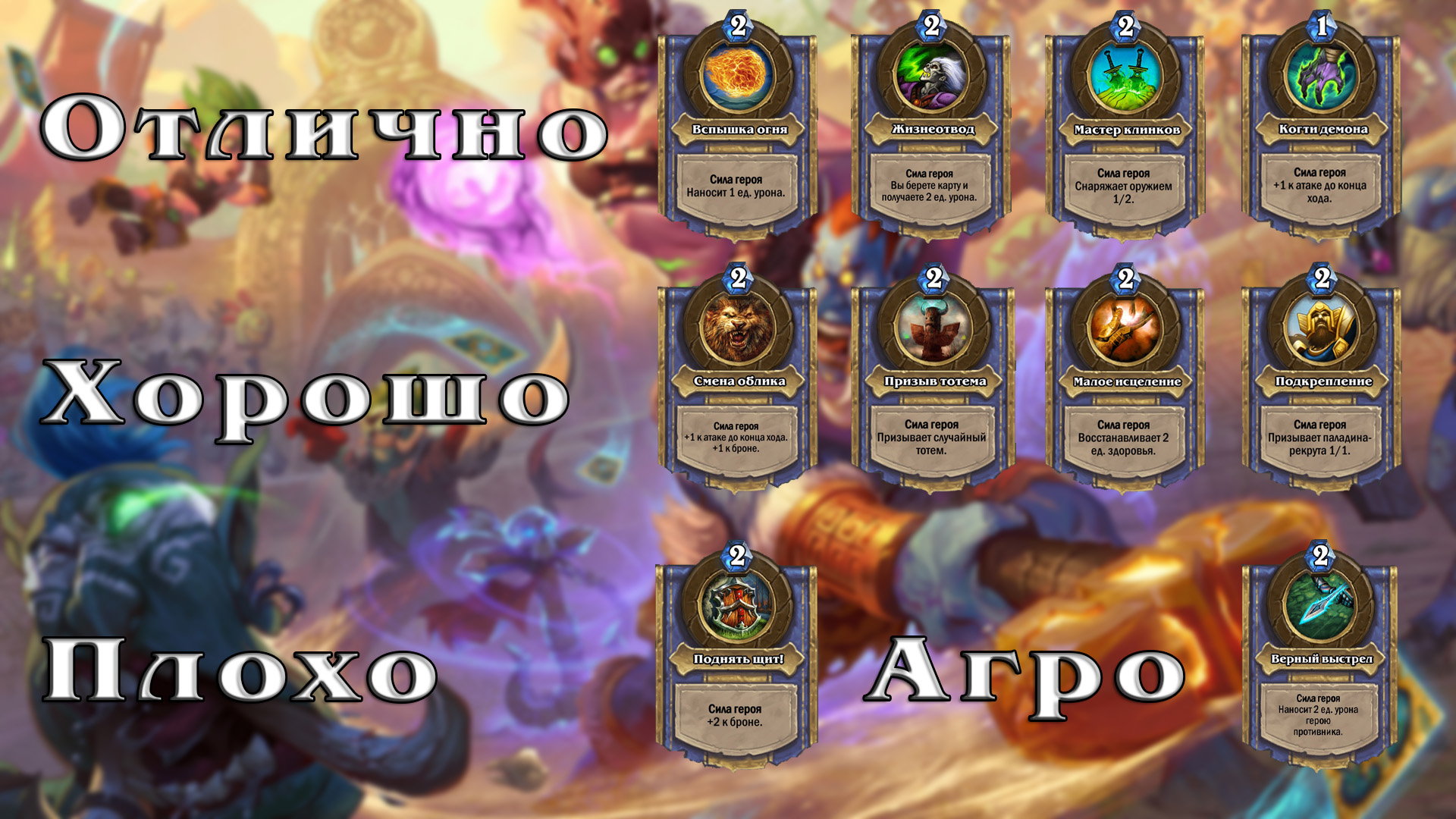 Характерные особенности, во многом отвечающие за силу класса на Арене, остались неизменны. Карты оружия по-прежнему очень сильны — еще одна причина выбрать Воина в качестве первого пика. Классовые карты для генерации Прихвостней также будут хороши в любом типе колоды — их можно получить, выбрав Шамана, Воина или Жреца на первом пике либо Чернокнижника или Разбойника — на втором. Общие правила игры на Арене остались прежними: в большинстве случаев вы будете играть мидрендж-колодой с небольшими отклонениями в сторону агро или контроля, за исключением тех случаев, когда выбираете силу героя Охотника на втором пике. Контролируйте стол, разменивайтесь через оружие и силу героя, сохраняя ваших существ, собирайте колоду с достаточным количеством ранних дропов, чтобы не пропускать первые ходы — зачастую именно старт игры решает исход партии. С общими правилами игры на Арене можно ознакомиться в гайдах по каждому классу; некоторые из них были написаны в мете Руин Запределья, некоторые — в мете Некроситета, но в плане классового геймплея все они до сих пор актуальны.