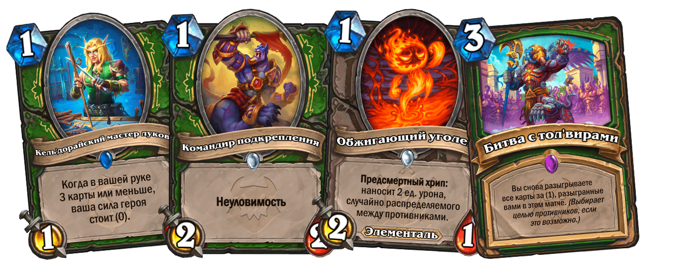 Фейс Охотник уже много дополнений не был так силен, как сейчас. С выходом КАТАКЛИЗМА архетип обзавелся невероятно мощной картой — Битва с толвирами. Она не только дает огромное количество ресурсов, но и позволяет буквально с нуля восстановить потерянный стол.