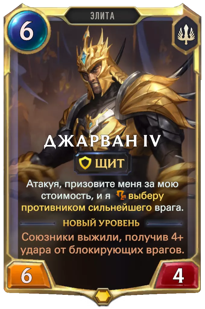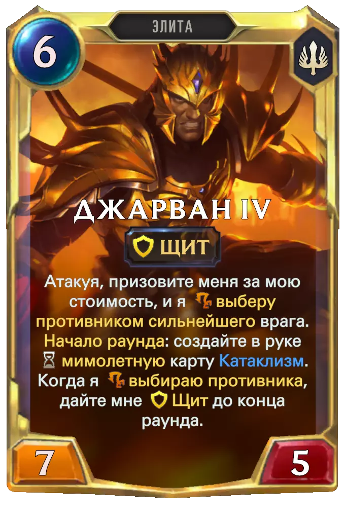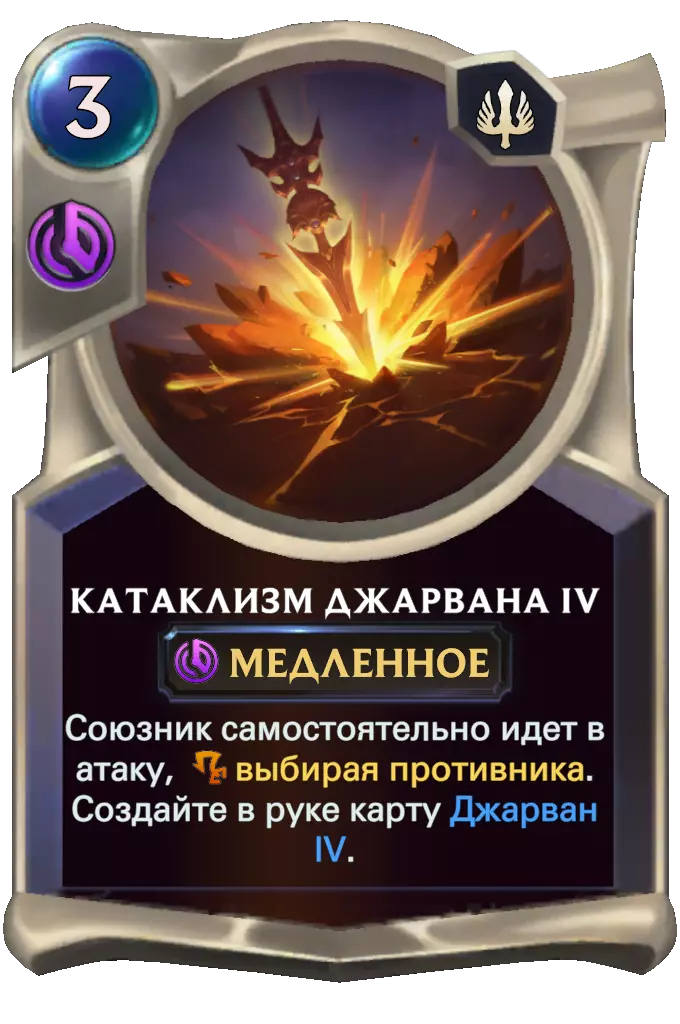 Вторая форма Джарвана 4 изрядно отличается от первой формы не только усилившимися показателями характеристик атаки и здоровья. Теперь у карты также лишен её главный минус, а именно отсутствие постоянного навыка Щита, что восстанавливается у второй формы вашего чемпиона в начале каждого сражения с вражеским бойцом. Также важной особенностью является способность, которая в начале каждого раунда будет давать нам в руку заклинание Катаклизм в мимолетной форме. Это раскрывает нам весьма широкие просторы для моделирования нашей атаки. Ведь мы можем как вытянуть вражеского бойца нашим слабым существом, чтобы не дать оппоненту заблокировать наших других бойцов. Или можем наоборот, вытянуть самого слабого бойца оппонента, чтобы он не мог с помощью карт на усиление как-то бесплатно забрать уже нашего бойца. И да, следует указать, что при использовании Катаклизма существо идёт САМО в атаку, то есть после того, как оно сразилось с бойцом оппонента — мы можем отправить в атаку его и всех остальных наших бойцов. Такой широкий вектор по выбору варианта атаки, или защиты, ведь Катаклизм мы можем использовать и когда фаза атаки у врага, надо использовать всегда по максимуму.