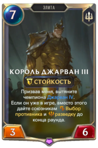 При грамотном распределении ресурсов, и при помощи Джарвана 4, можно спокойно обеспечивать контроль стола. Но если этого будет не хватать, или же у противника появится излишне многочисленный стол, то в таких случаях молодому будущему правителю придёт на помощь уже изрядно поседевший, но всё также бодрый духом и мудрый Джарван 3. Который своим выходом на стол ознаменует план действий для всех ваших существ, дав им навык Выбора противника и навык Разведки до конца хода. И да, следует указать, что для срабатывания этого эффекта у вас на столе уже должен быть Джарван 4, иначе король Джарван 3 просто доберет Джарвана 4 из вашей колоды.