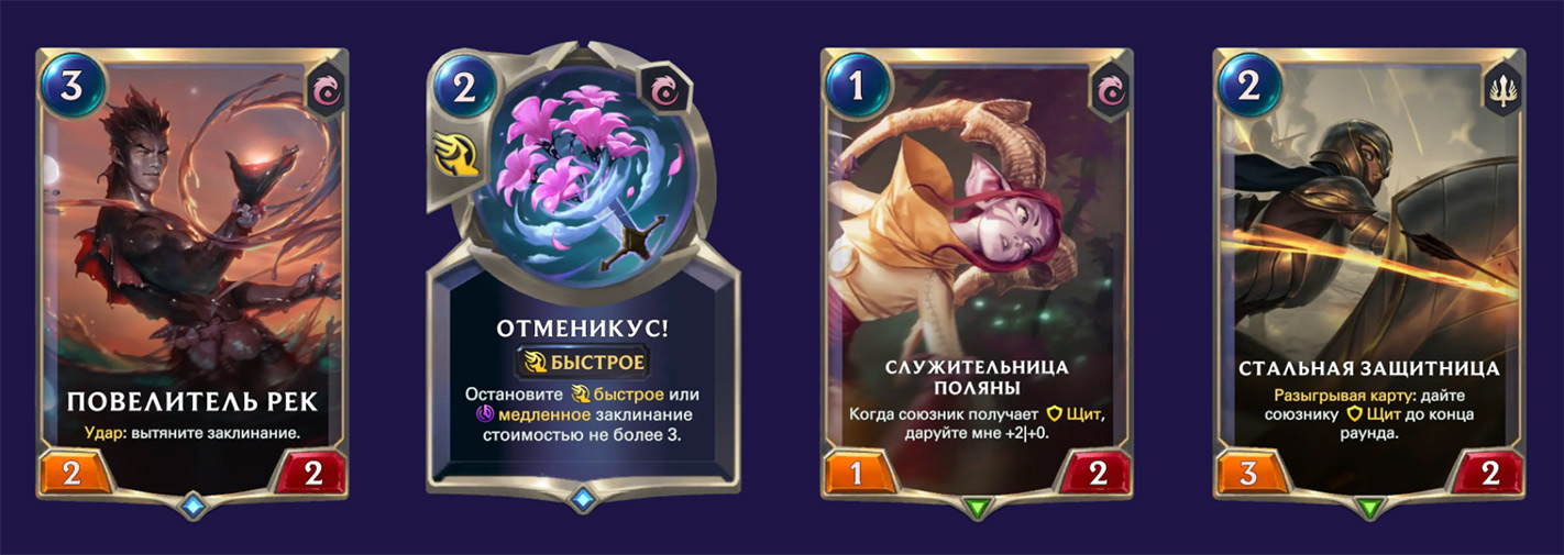 Также существом, кого тоже следует всегда стараться оставлять в живых является Повелитель рек. Ведь фактически он является нашим единственным добором карт из колоды. Можно даже сказать, что больше добора нам не нужно, так как Повелитель рек отлично работает с такими картами, как: Поединок и Массированный удар. Поэтому если для их применения не нашлось лучшего момента, стоит придержать их до Повелителя рек, чтобы перебрать с него максимум карт. Средняя игра чаще всего представлена нашими прославленными чемпионами, а также такими картами, как: Кричащий дракон и Король Джарван 3. Лучшим для перехода в эту стадию партии будет момент, когда у вас на столе останется пару ваших бойцов. Например, это будут Повелитель рек и Протеже Лоранов. А против вас скажем играет Spiders Aggro, и уже тоже имеет пару бойцов на столе и Элизу. В данном противостоянии будет более выгоден Шен, нежели Джарван 4, ведь он имеет более оборонительные характеристики и эффект. А Джарван и стоит дороже, и при своем выходе на стол сможет забрать лишь одного вражеского бойца. А далее, потеряв Щит, становится отличной целью для заклинаний вашего оппонента. Выбрав Шена мы не только выиграем в плане более контрольных механик, но и на оставшуюся ману сможем использовать наши заклинания по типу Парирования или Пристанища духа. Они также обеспечат выживаемость наших бойцов при блоке либо атаке, и плюс помогут усилить Служительницу поляны, разумеется, если она имеется на столе.
