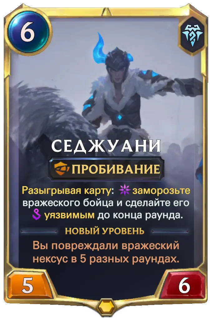 Вторые формы этих чемпионов невероятно сильны, и роли у них всё те же. Ренектон получает улучшенные способности и новый эффект, который срабатывает при каждой его атаке и даёт ему ещё +3/+3 к характеристикам до конца раунда. Конечно, это далеко не самый интересный и изысканный эффект, что даётся чемпионам на втором уровне, но, как и писалось выше, он является невероятно сильным и позволяет инициировать атаки и оказывать сильное давление на врага. Седжуани же поможет защититься от давления с противоположной стороны и не потерять в темпе. Её вторая форма имеет эффект, который срабатывает, когда вы впервые наносите урон по вражескому нексусу, замораживая всех вражеских бойцов. Этот эффект прекрасно синергирует вместе с Уязвимостью, которая в свою очередь позволяет нашим могучим бойцам с навыком Пробивания уничтожать существ противника, попутно нанося излишний урон нексусу оппонента.