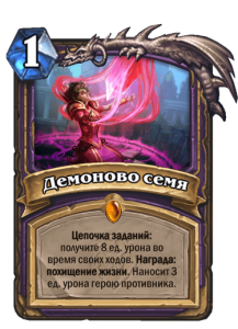 Вторая составляющая архетипа — это квестлайн Демоново семя. Во-первых, он позволяет активно использовать силу героя, не боясь смерти, поскольку 1 и 2 стадии цепочки дают герою исцеление. А во-вторых, благодаря Экскурсоводам, Обратной вспышке и Воскрешению мертвых, задача выполняется очень быстро. И так же быстро удешевляются Мясистые великаны. Карта была понерфлена, но все равно часто успевает выйти на стол очень рано.