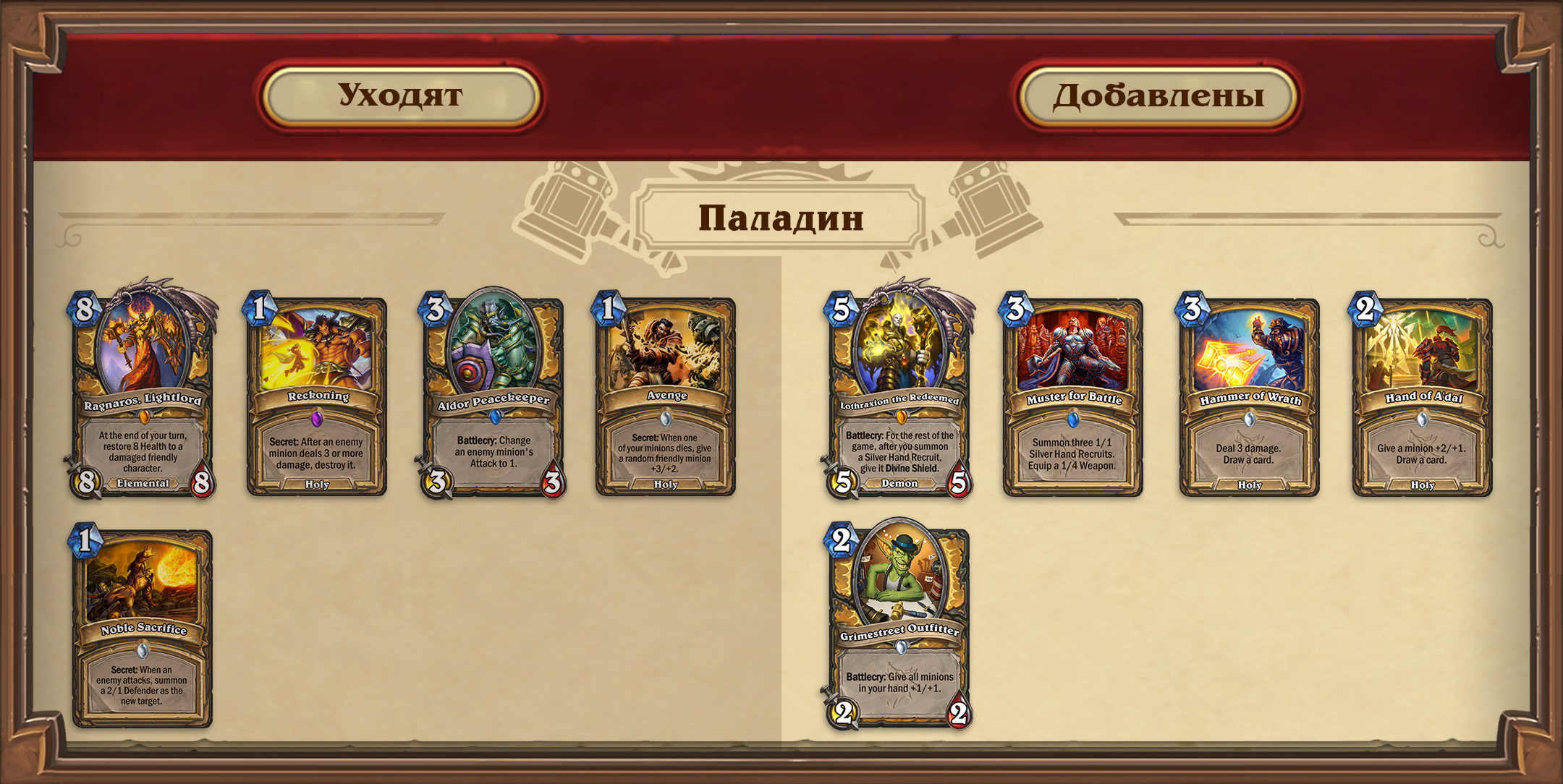 Мы надеемся, что у нас получится выпускать подобные обновления в будущем более часто. Они направлены не на сиюминутную встряску положения вещей, а на более далекую перспективу, чтобы сделать Hearthstone лучше. Такие обновления позволят нам решить проблемы, которые привязаны не к определенному набору, а к классу в целом: например, когда идентичность класса требует изменений или когда набор А не сочетается с набором B. Мы произвели предварительные изменения для Паладина в этом Основном наборе, чтобы узнать, как класс будет чувствовать себя без секретов. Мы планируем взглянуть на это изменение класса и обсудить дальнейшие позднее в этом году.