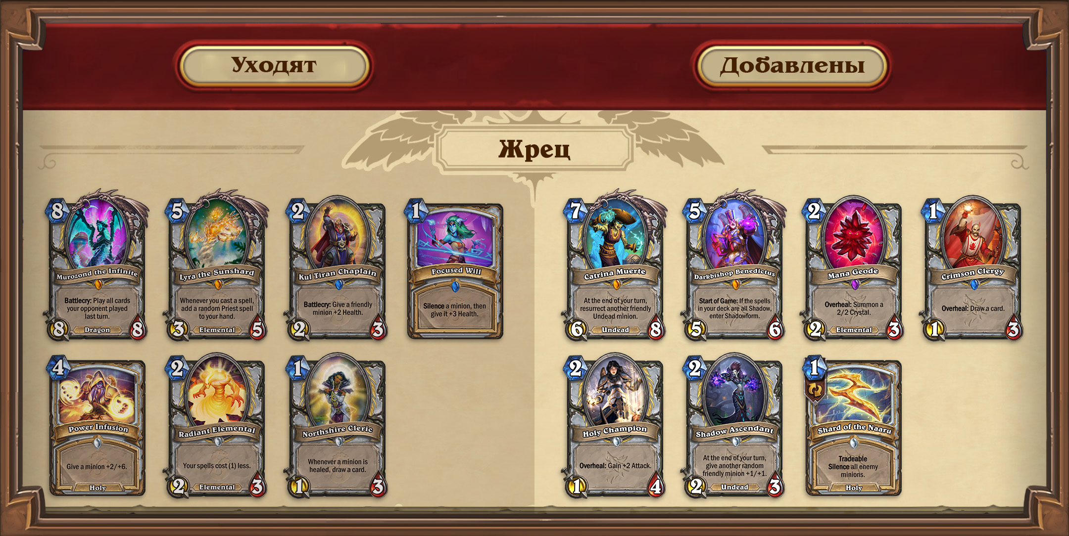 По мере подготовки к запуску «Фестиваля легенд» стало ясно, что Жрецу не помешает обновление в Основном наборе. Процесс этого обновления состоял из перебора ключевых механик класса, доработки стратегий, геймплей которых нам нравится, отказа от стратегий, которые не работают, и перестановки тематик и механик на будущее.