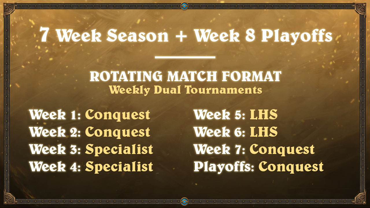 В течение первых семи недель игроки будут соревноваться в турнирах с выбыванием после двух поражений, начинающихся по четвергам. Восемь победителей будут сражаться друг с другом на выходных. Игроки будут получать очки в зависимости от общего количества побед на каждой неделе, что определит финальный рейтинг перед играми плей-офф.