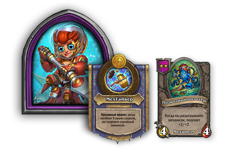 - [2-й уровень таверны, механизм] 4/4. Когда вы разыгрываете механизм, получает +2/+2.