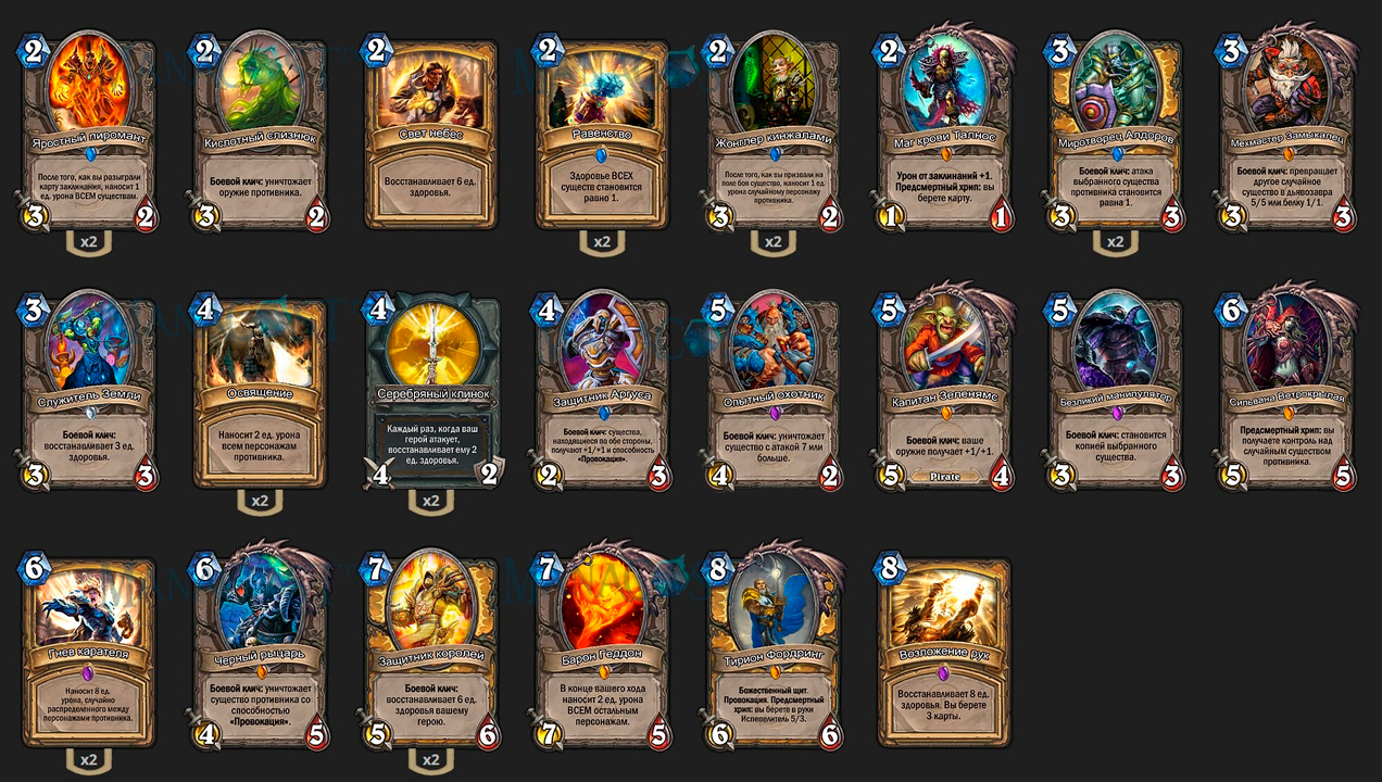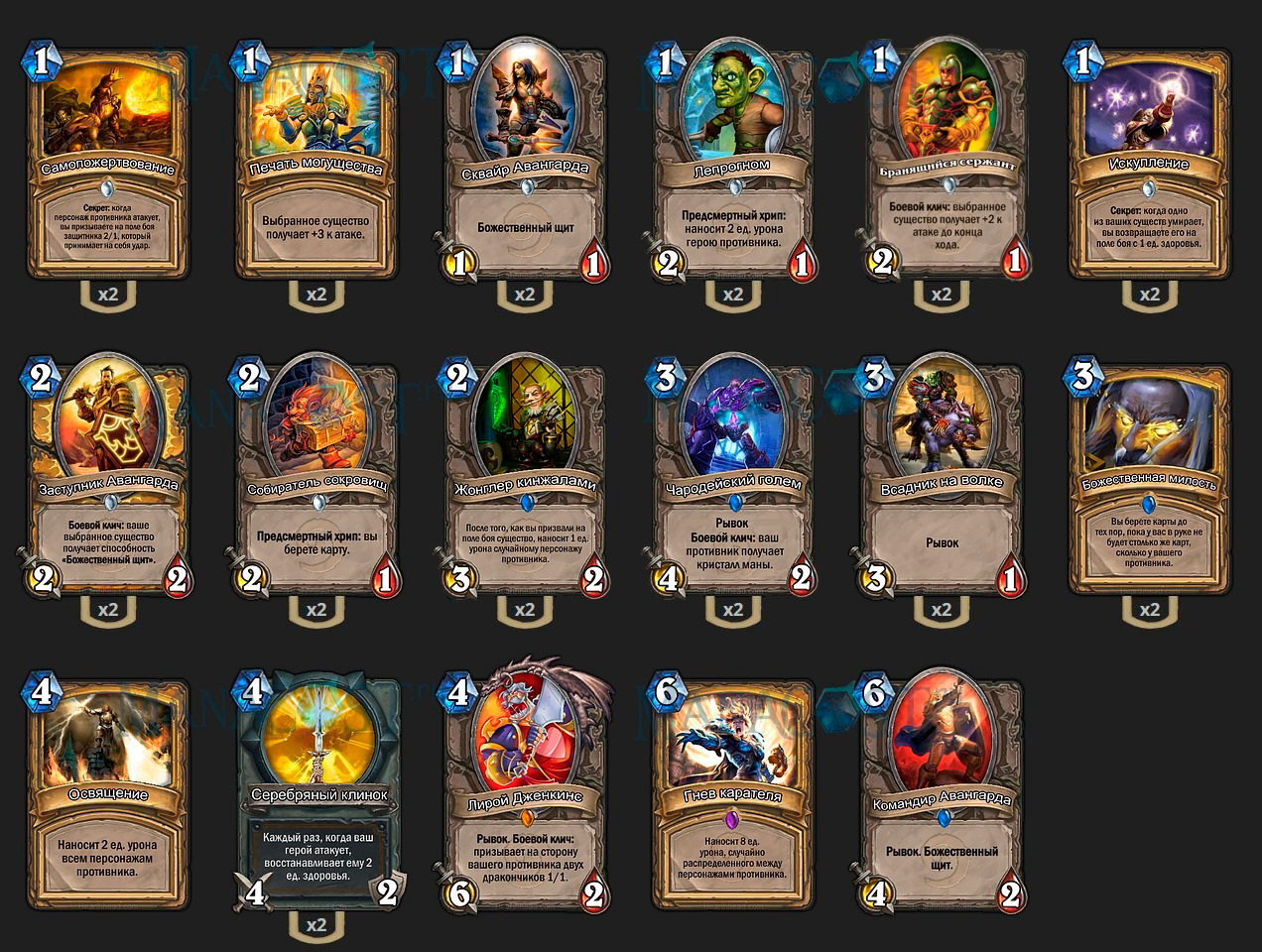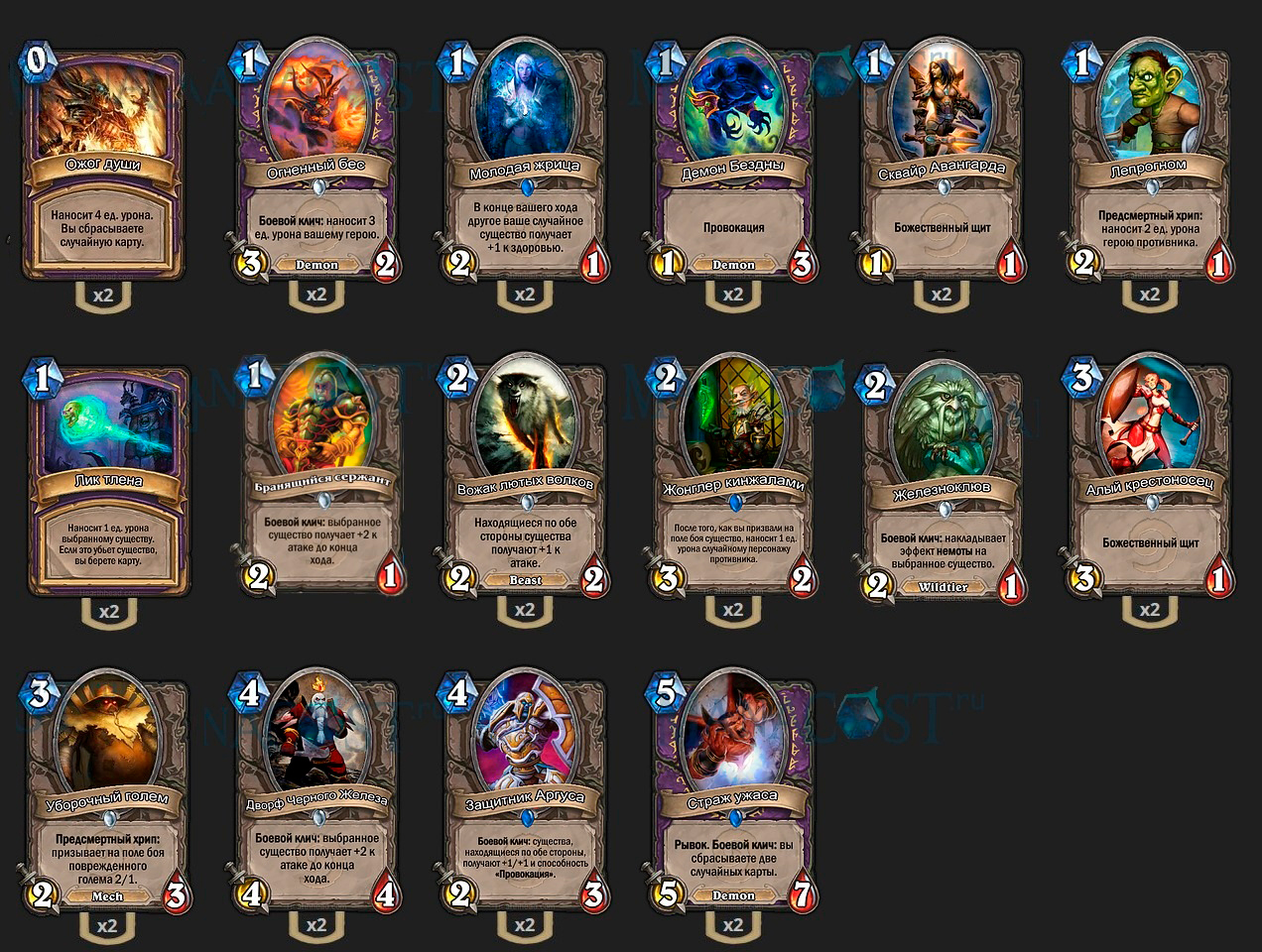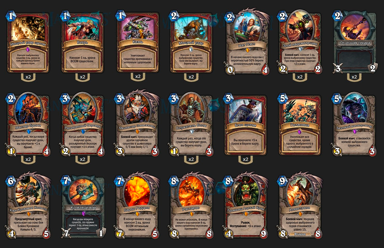 Классическая агрессивнейшая колода старой меты с массой карт, которые нерфили за последние годы. Обратите внимание на комбинацию Голодный канюк + Спустить собак, которая пополняет карты в руке Рексара. В остальном колода простая и прямолинейная, но при этом эффективная. Играли и более тяжелыми Мидрейндж Охотниками. В сборке все еще много агрессивных карт, а также есть комбо Голодный канюк + Спустить собак, но чуть больше тяжелых зверей. С ними проще давить самые медленные архетипы меты. Зоолок играет совсем другие карты в сравнении с нынешними версиями, но основные принципы игры не меняются. Это самая сложная агро колода классического Hearthstone, но в умелых руках результативная. Вероятно, лучшая контроль колода классики рассчитывает на ранний выход тяжелых великанов: им можно баффнуть провокацию или зачистить с помощью Пламени Тьмы стол. В колоде есть и ОТК комбинация на 20 урона: Лирой Дженкинс + Переполняющая мощь + Безликий манипулятор. Еще одна знаменитая колода классического Hearthstone рассчитывает на постоянные заморозки стола и вражеского героя. Выигрывает такой Маг за счет взрывного урона (обратите внимание на комбо Ледяная стрела + Ледяное копье), а выживает с помощью пары Ледяных глыб. Фриз Маг считается одной из самых сложных колод классического Hearthstone. Так называемый Pay-2-win Воин («заплати, чтобы победить») требует много классических легендарок и эпиков. В колоде много привычных Контроль Воину карт, но в отличие от нынешних версий, старые Контроль Воины побеждали за счет тяжелых угроз в лейтгейме. Едва ли самая сильная, но примечательная колода ОТК Воина. Полная комбинация: Разъяренный ворген + Внутренняя ярость + Буйство + Рывок. Сила Агро Паладина в Божественной милости. Заклинание позволяет восполнить руку Утера, особенно при встрече с медленными колодами. Дорогая и не самая сильная колода, но у класса не было лучше. Паладин не был так силен во времена классики. Едва ли чего-то сверхъестественного от него можно будет ждать в Классическом режиме. Еще один слабый класс во времена классики. В колоды Шамана просто брали неплохие обычные и классовые карты в надежде, что всё это заиграет вместе. Жрец — самый слабый класс классики. Играл преимущественно в контроль стиле, но серьезно зависел от своевременного захода нужных карт. Чем вы будете играть в Классическом режиме? Как вы думаете, кто станет лидером меты? Делитесь вашими мыслями в комментариях. Удачи!![]()