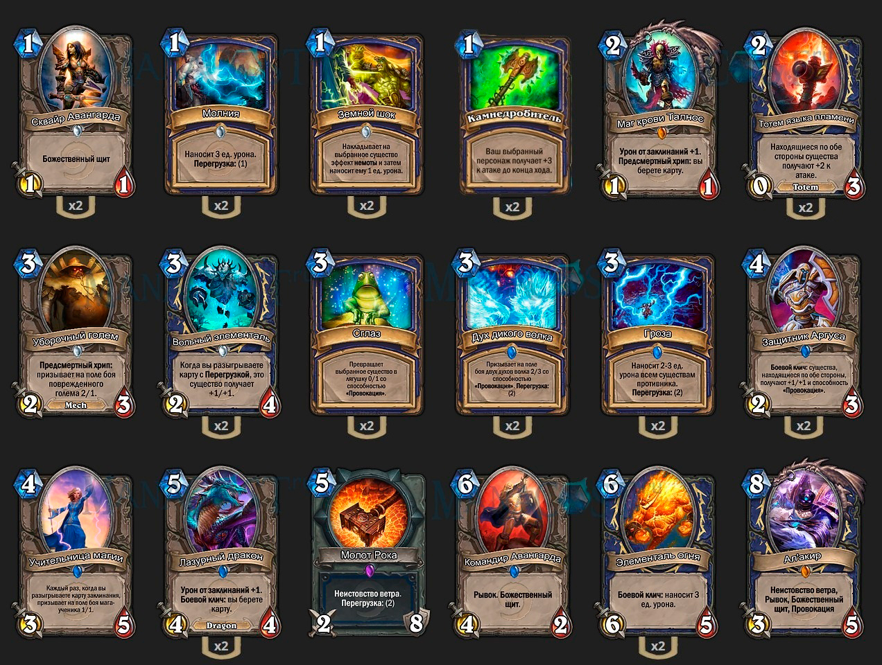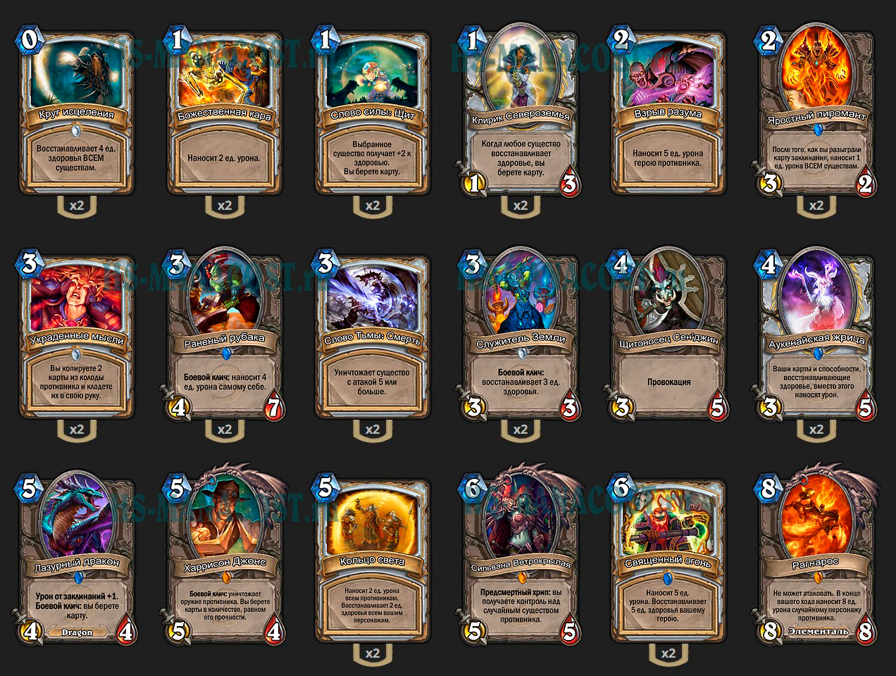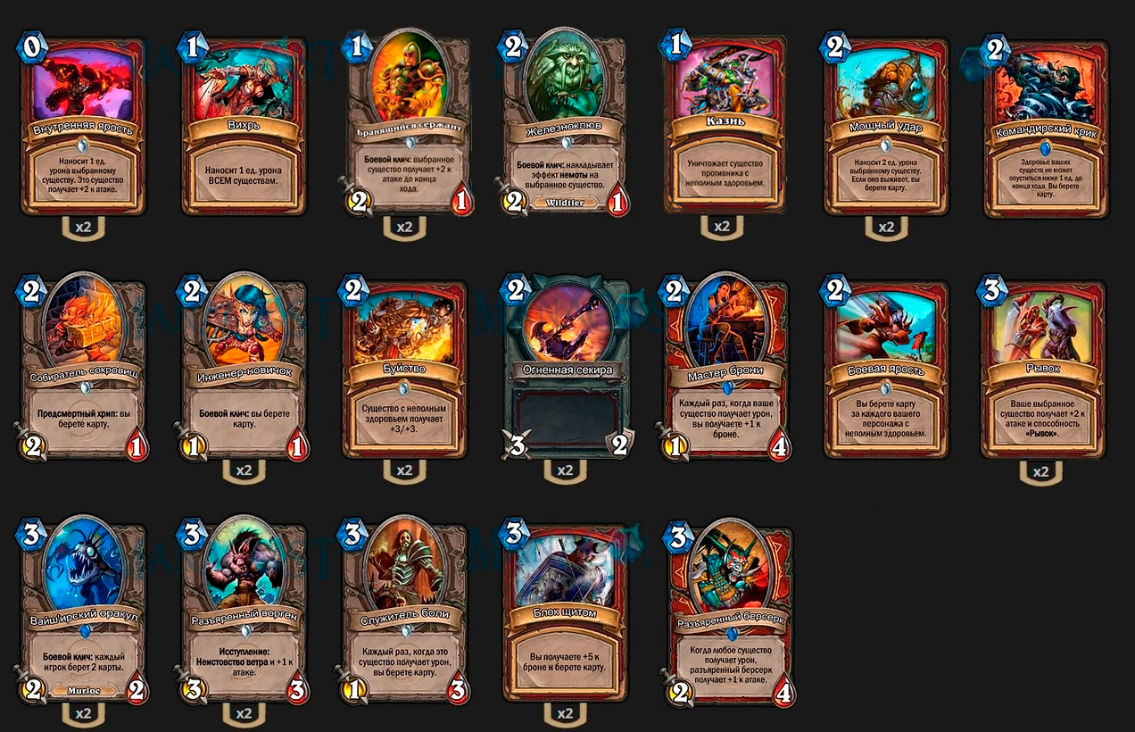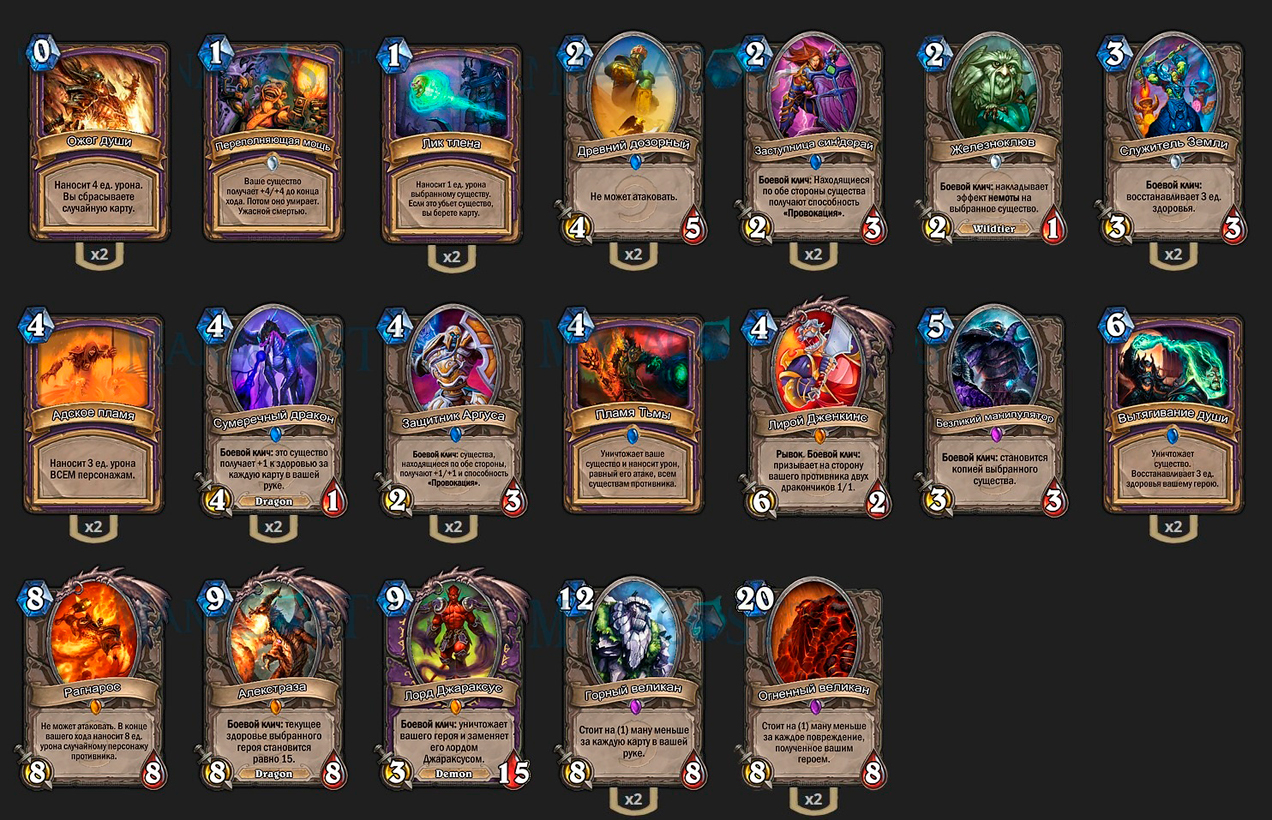 Классическая агрессивнейшая колода старой меты с массой карт, которые нерфили за последние годы. Обратите внимание на комбинацию Голодный канюк + Спустить собак, которая пополняет карты в руке Рексара. В остальном колода простая и прямолинейная, но при этом эффективная. Играли и более тяжелыми Мидрейндж Охотниками. В сборке все еще много агрессивных карт, а также есть комбо Голодный канюк + Спустить собак, но чуть больше тяжелых зверей. С ними проще давить самые медленные архетипы меты. Зоолок играет совсем другие карты в сравнении с нынешними версиями, но основные принципы игры не меняются. Это самая сложная агро колода классического Hearthstone, но в умелых руках результативная. Вероятно, лучшая контроль колода классики рассчитывает на ранний выход тяжелых великанов: им можно баффнуть провокацию или зачистить с помощью Пламени Тьмы стол. В колоде есть и ОТК комбинация на 20 урона: Лирой Дженкинс + Переполняющая мощь + Безликий манипулятор. Еще одна знаменитая колода классического Hearthstone рассчитывает на постоянные заморозки стола и вражеского героя. Выигрывает такой Маг за счет взрывного урона (обратите внимание на комбо Ледяная стрела + Ледяное копье), а выживает с помощью пары Ледяных глыб. Фриз Маг считается одной из самых сложных колод классического Hearthstone. Так называемый Pay-2-win Воин («заплати, чтобы победить») требует много классических легендарок и эпиков. В колоде много привычных Контроль Воину карт, но в отличие от нынешних версий, старые Контроль Воины побеждали за счет тяжелых угроз в лейтгейме. Едва ли самая сильная, но примечательная колода ОТК Воина. Полная комбинация: Разъяренный ворген + Внутренняя ярость + Буйство + Рывок. Сила Агро Паладина в Божественной милости. Заклинание позволяет восполнить руку Утера, особенно при встрече с медленными колодами. Дорогая и не самая сильная колода, но у класса не было лучше. Паладин не был так силен во времена классики. Едва ли чего-то сверхъестественного от него можно будет ждать в Классическом режиме. Еще один слабый класс во времена классики. В колоды Шамана просто брали неплохие обычные и классовые карты в надежде, что всё это заиграет вместе. Жрец — самый слабый класс классики. Играл преимущественно в контроль стиле, но серьезно зависел от своевременного захода нужных карт. Чем вы будете играть в Классическом режиме? Как вы думаете, кто станет лидером меты? Делитесь вашими мыслями в комментариях. Удачи!![]()