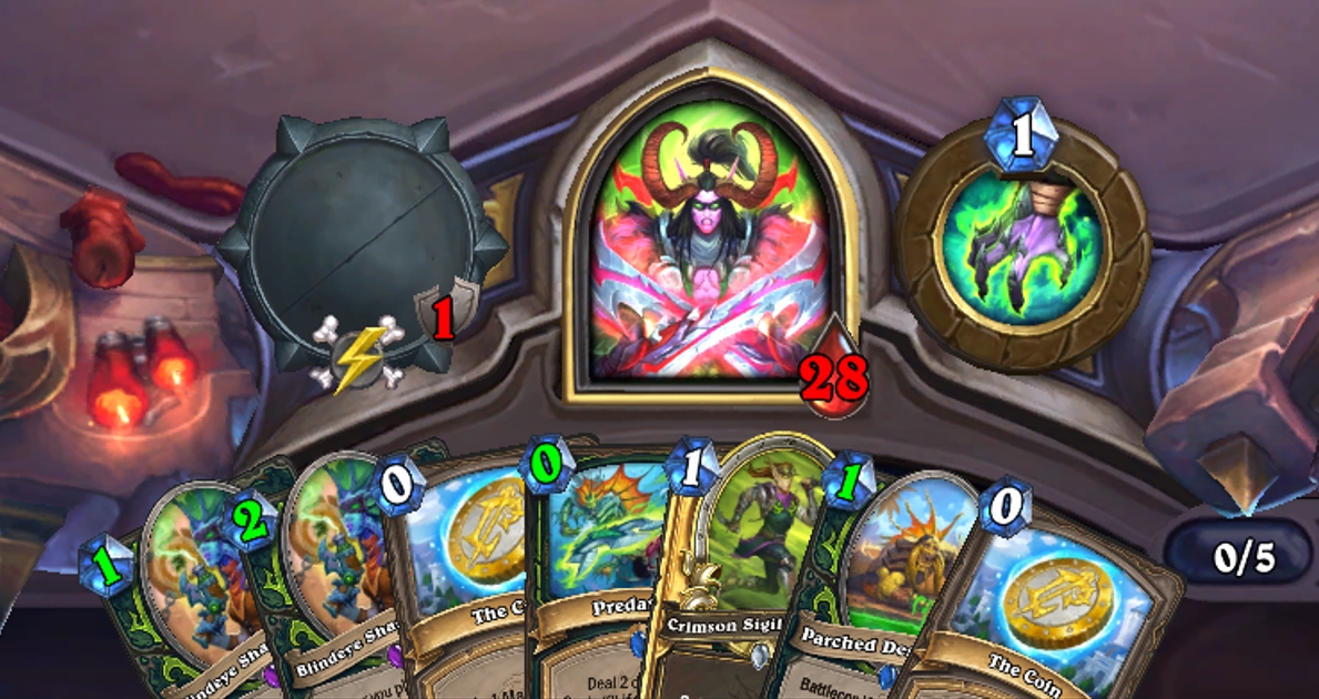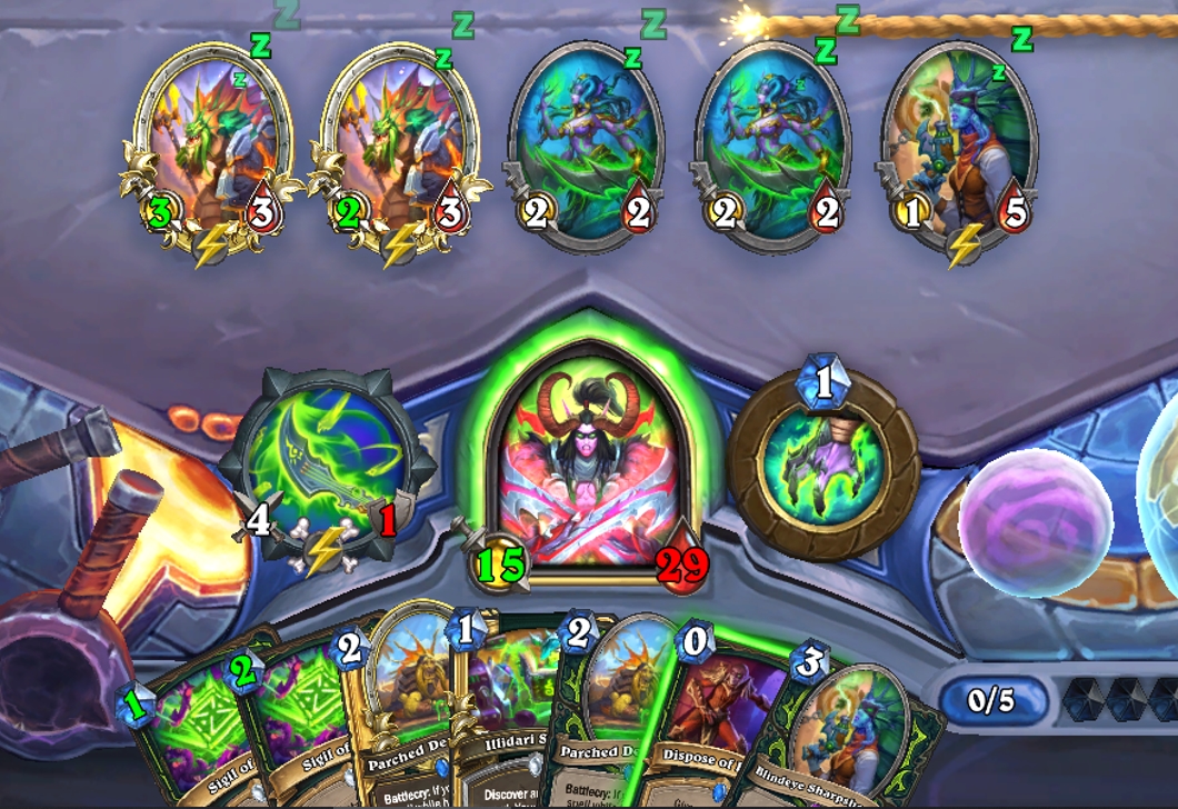 Комбинации со Слепым стрелком хочется провернуть уже на 4-6 ходах, но главная трудность этих комбинаций — низкий запас маны Охотника на демонов. Тем не менее Иллидану часто удается это сделать и одержать победу. Но для успеха такого плана нужны Монетки, бесплатные заклинания и наги.