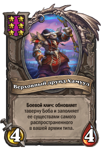 Все это важно из-за Верховного друида Хамуула. Представьте себе ситуацию: вы играете за Зиреллу в лобби, где нет зверей и свинобразов, а ваш компаньон — зверь. Продайте со стола всех лишних существ других рас и сыграйте Верховного друида Хамуула на 6 уровне таверны. Боб предложит 6 Адаптозавров, которых можно скупить в течение нескольких ходов при поддержке силы героя. Здорово, что компаньон Зиреллы еще и получит дополнительные характеристики за розыгрыш каждого Адаптозавра, потому что у них одинаковые атака и здоровье.