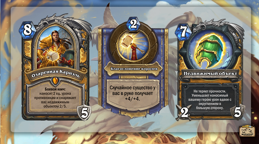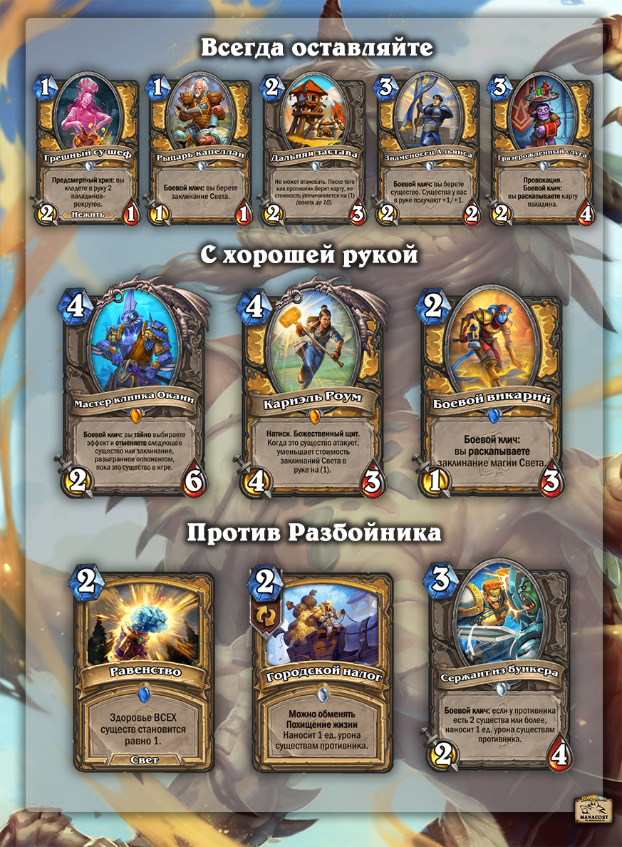 Контроль Пал — дорогая дека. И дешевле ее сделать сложно. Вы точно не обойдетесь без Озаренной Кариэль. От каждой другой легендарки по-отдельности можно отказаться, но точно не от всех — тогда Паладин станет совсем уж слабым. Не страшно, если нет 1-2 легендарок. Вместо них берите Ядовитого скорпида, Школьного учителя, Назойливую чародейку, Безумного герцога Теотара, Осужденную Сильвану или другие карты.