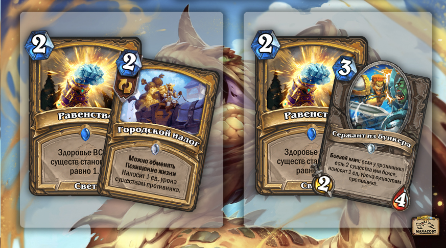 У Контроль Паладина есть несколько массовых зачисток — Равенство в комбинации с Городским налогом, Сержантом из бункера или Мастером клинка Сауро, а также Анахронос. Эти комбинации особенно полезны в матч-апе с Миракл Разбойником, но помогут и против других дек, которые играют со стола — Эволв Шамана, Биг Спел Мага, Бесолока, а часто и Разбойника на воровстве. Вы часто достанете Равенство из колоды с помощью боевого клича Рыцаря-капеллана. Он также может добрать и Ролл из рыбосвета.