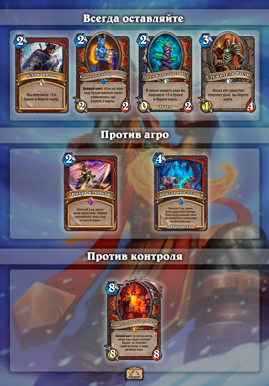 Вы можете сделать несколько замен в колоде. Чаще всего убирают Фотографа Физзла, Мощный удар щитом, Подарок Гарроша и Обеззараживание.