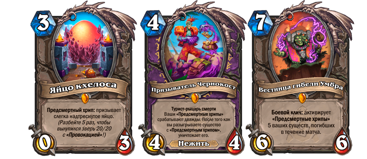 - Призыватель Чернокост. Это турист Рыцаря Смерти, который позволяет нам взять в колоду две карты: Вечную пересадку и Труп на палочке. Обе эти карты, как и сам Призыватель Чернокост, отлично работают с Кхелосом.