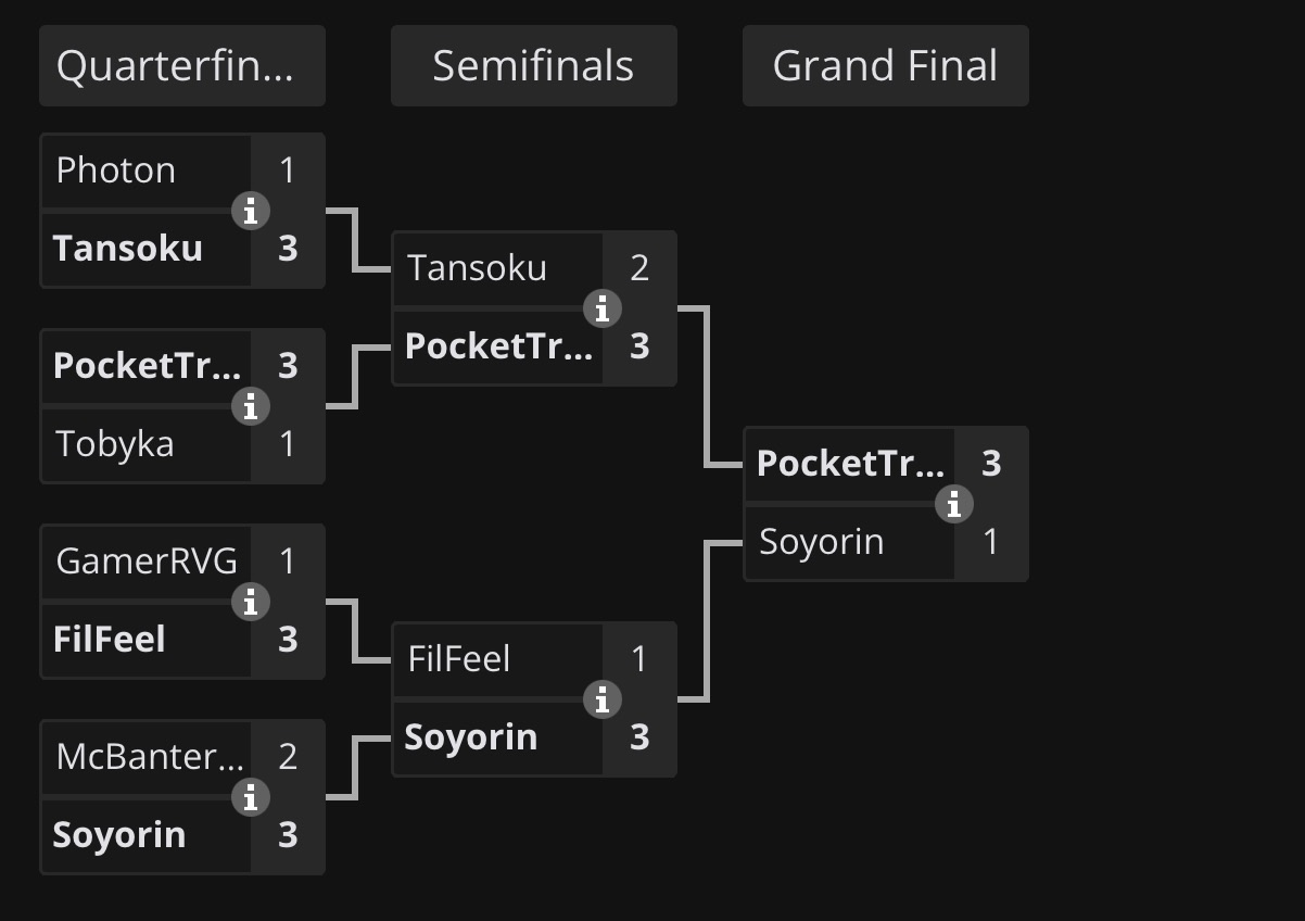 Победителем турнира стал PocketTrain! Помимо призовых PocketTrain, Soyorin, FilFeel и Tansoku получили приглашение на Чемпионат мира, который пройдет в конце этого года.