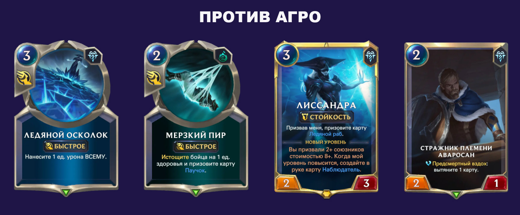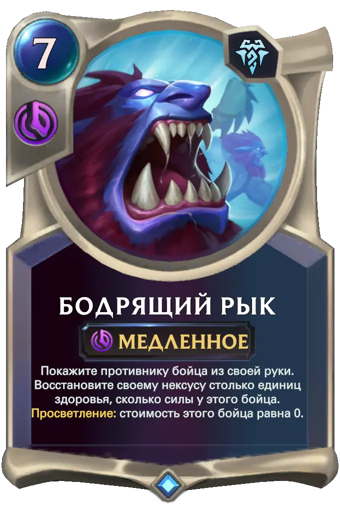 Такого пункта в предыдущих статьях не было, но в этой он необходим, так как версия, показанная в статье, хоть и сильна, но не идеальна. В зависимости от ранга и положения звезд на небосводе вам будут попадаться совершенно различные колоды в противники. А в текущей мете очень много быстрых колод, поэтому решение по замене Зажигающего свечи и одного Тролльского напева на две копии Бодрящего рыка оправдано, так как наша основная версия страдает из-за отсутствия сильных заклинаний на восстановление здоровья. А Бодрящий рык можно абсолютно прекрасно скомбинировать с Наблюдателем и восстановить тем самым нексусу 11 единиц здоровья. А если вы ещё достигли Просветления, то есть у вас 10 единиц маны, то ваш Наблюдатель, да и вообще любой из ваших бойцов, кто станет целью заклинания Бодрящий рык — снизит свою стоимость по мане до нуля. Также в колоду за место этих двух карт можно положить заклинание Погибель. Она поможет в конце игры, да и в её середине, контролировать стол, чтобы дожить до Рабов морозных стражей. Или же хорошо очистить стол с помощью Погибели перед выходом на стол тех самых Рабов морозных стражей, чтобы они могли беспрепятственно раскрошить нексус оппонента.