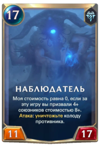 Самая интересная опция нашей колоды- механика ОТК. Вся суть, а вернее ключ к сотворению этого связан с Лиссандрой. Именно она, когда повышает свой уровень, призывает Наблюдателя. Такими союзниками будут наши Рабы морозных стражей, что были призваны из места силы Ледяной раб, плюс ещё одним существом за 8 единиц маны будет считаться Ледяной столп Трандла, поэтому старайтесь его разыгрывать вместе с Лиссандрой на столе. Также у нас в колоде есть самостоятельное существо за восемь единиц маны, а именно Смотрящее, но о нём поговорим немного позже. Так вот Наблюдатель, в свою очередь, имеет как крутые характеристики, так и не менее крутую стоимость в мане, а именно 17 единиц. Стоить ровно ноль маны он будет только тогда, когда вы призовете 4+ союзников за 8+ маны. Тогда, при атаке этот древний великан уничтожит колоду вашего противника. А в Рунтерре, если ваша колода закончилась, то вы проигрываете. Поэтому и поражение вашего противника, и ваша победа над ним, не заставят себя долго ждать.