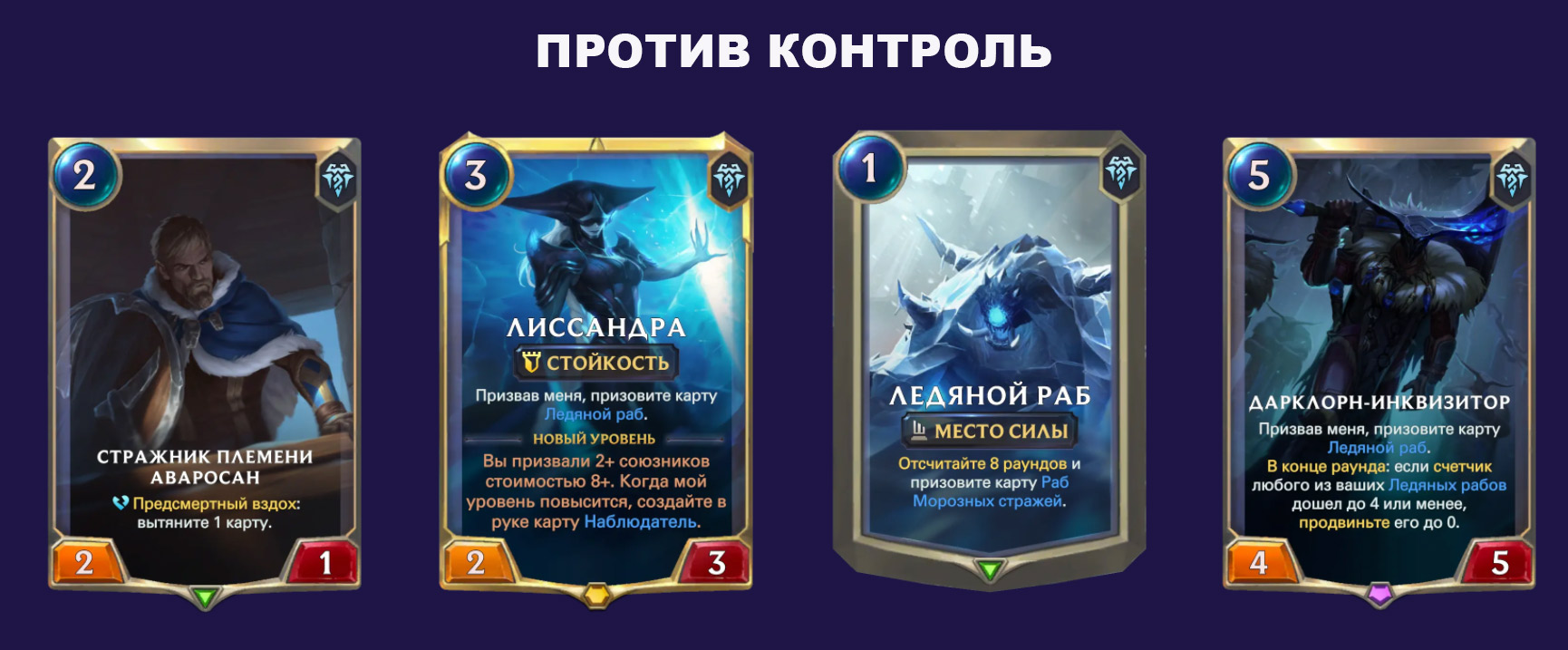 Такой вариант колоды довольно сильно отличается от основного варианта. И честно говоря, по нему нужно делать отдельную статью и так же всё подробно описывать. Но кратко можно его и сейчас описать. В сущности колода различается, как своим большим количеством зачисток стола, так и своим главным условием победы. Если в основной версии вам будут приносить победу Рабы морозных стражей, то в этой версии это будет уже традиционный гость всех тяжелых колод из Сумрачных островов, один из номинантов награды “Самый быстрый делитель здоровья Нексуса” — Командир Ледрос. Чтобы начать быстрее “делить” здоровье нексуса вашего оппонента нашим командиром, в колоде лежит Катализатор Эонов, что может не только дать вам ману, но и восстановить здоровье вашего нексуса. Также в колоду были добавлены такие карты, как Холодные ветра и Погибель. Первая карта призвана сдержать натиск соперника, либо изменить показатели атаки вражеских бойцов, чтобы произвести выгодные размены во время блока, либо атаки. А вот вторая карта, а именно Погибель, та самая зачистка всего стола, что не хватает основному варианту колоду. Не менее интересной картой, которая была добавлена в эту версию является Бодрящий рык. Как раз она и ещё пара карт обеспечивают то необходимое количество восстановления здоровья, чтобы спокойно переживать своих быстрых оппонентов. Да, и статье по данной колоде быть! Возможно…