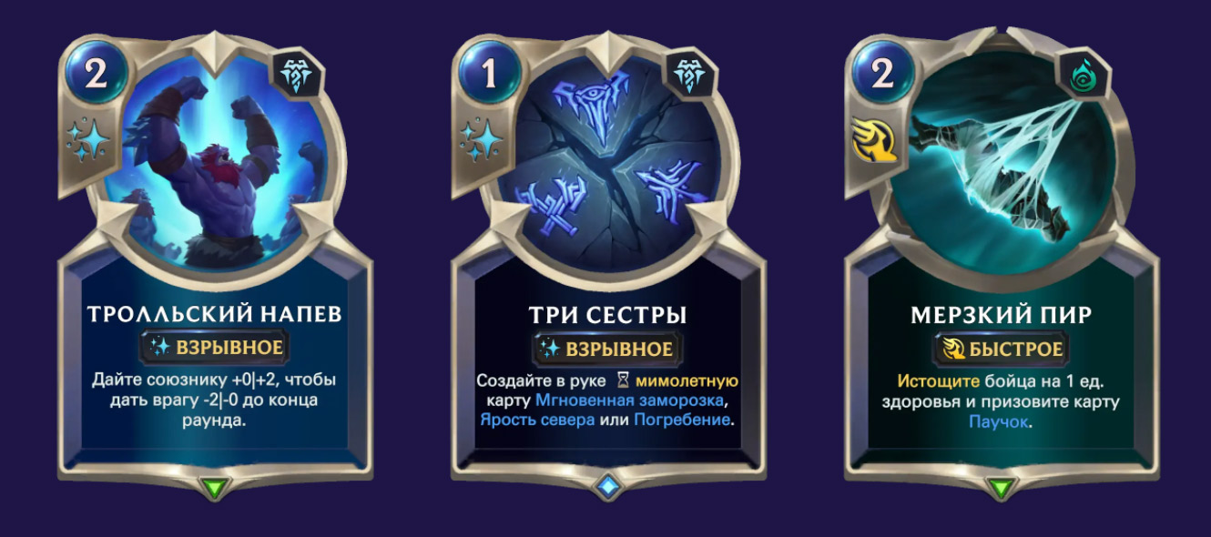 Начнем с самой модульной карты, а именно со взрывного заклинания Три сестры. Вся её модульность состоит в том, что она может дать вам на выбор три других заклинания, таких, как Мгновенная заморозка, Ярость севера и Погребение. И в зависимости от ситуации на столе вы выбираете нужную вам карту. Только помните, что она будет мимолетной, то есть будет сброшена с вашей руки в конце раунда, если вы её соответственно не используете. Если с заморозкой существ и заклинанием на повышение характеристик всё понятно, то с Погребением всё куда интересней. Ведь мы можем использовать это заклинание как на вражеского бойца, чтобы сбить темп противника и заблокировать ему один слот в резерве. Так мы можем использовать его и на нашего бойца, которого хотят уничтожить. При таком развитии событий он конечно тоже погибнет, но зато будет заново призван по отсчёту двух раундов. Что лучше, нежели он бы просто погиб. Тролльский напев более прямолинейное заклинание, которое вам будет очень сильно помогать производить выгодные блоки существ на соответствующей фазе, или же также успешно атаковать нексус вашего оппонента.