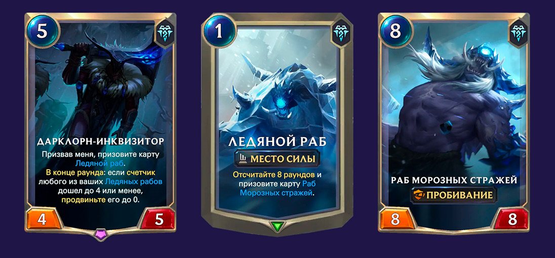 А сейчас давайте поговорим про среднюю часть партии. Вся его суть заключается в одном из наших новых сторонников, что прибыл в LoR вместе с Лиссандрой и остальными. А речь идёт про одного из слуг ледяной госпожи — Дарклорна-инквизитора. Именно он и есть тот ключ, что откроет нам путь на контратаку. А всё благодаря его эффекту, ведь согласно ему при выходе на стол он призывает одного Ледяного раба. Но если под конец раунда счётчик одного из ваших Ледяных рабов дошёл до 4 или менее, он продвигает его до нуля. Чем призывает на стол Морозного стража, что при характеристиках 8/8 имеет навык Пробивание. Такого будет сложно игнорировать, а ещё труднее зачистить, когда их уже несколько. Конечно, для достижения такого результата нужно поставить Ледяных рабов на первый и второй ходы соответственно, а также найти Дарклорна-инквизитора на 5-6 ход, а лучше их найти парочку, если вдруг на первого у врага найдется ответ. Именно такой ход развития событий называется контратакой. Конечно, это выглядит несколько безумно и невозможно из-за того, что у колоды мало карт для добора. Но всё-таки, если такое произойдет, то вас будет не остановить. И давайте вернемся с небес на землю и посмотрим на нашу середину игры в реальности. Ведь зачастую ваши Ледяные рабы будут спать до начала поздней стадии партии. А их выход в средней стадии партии, сродни чуду, как и говорилось выше.