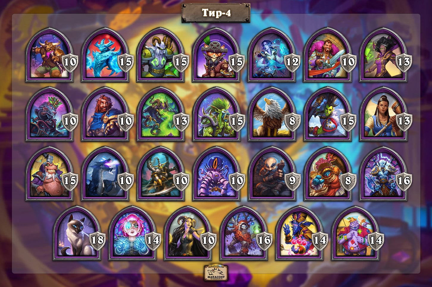 Список самых слабых героев патча с ужасным винрейтом. Особенно заметно, как отстает от всех остальных Алекстраза. Казалось бы, она является аналогом Азшары, но та на первом месте, а эта на последнем. Все просто: пул драконов в целом хуже драконов для случайной раскопки, а тир-4 драконы уступают нагам. Да, вокруг драконов можно построить сильный стол, но Алекстраза не дает достаточного буста, чтобы это случилось.