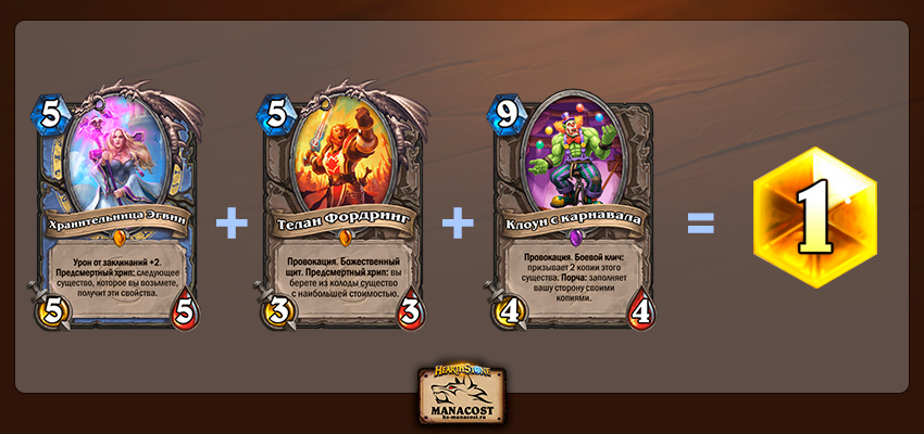Интересные комбинации предлагает новая Хранительница Эгвин. Игроки уже нашли топовые комбинации с Клоуном с Карнавала и новым Теланом Фордрингом. Магу осталось найти хоть какие-то дешевые заклинания, которые бы наносили урон по герою противника, а еще сильные десятые дропы для активации порчи.