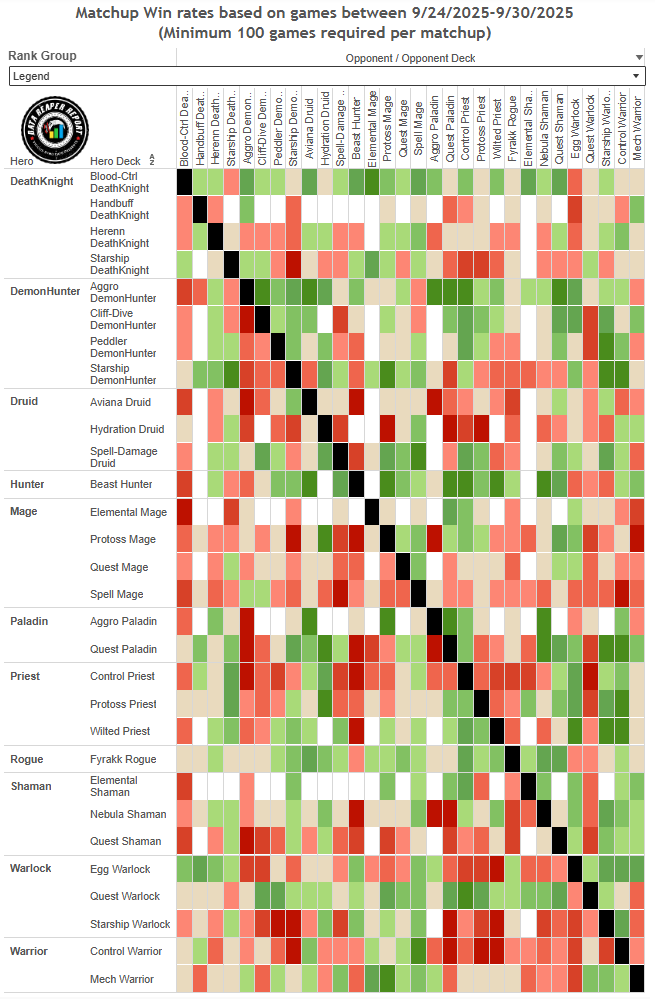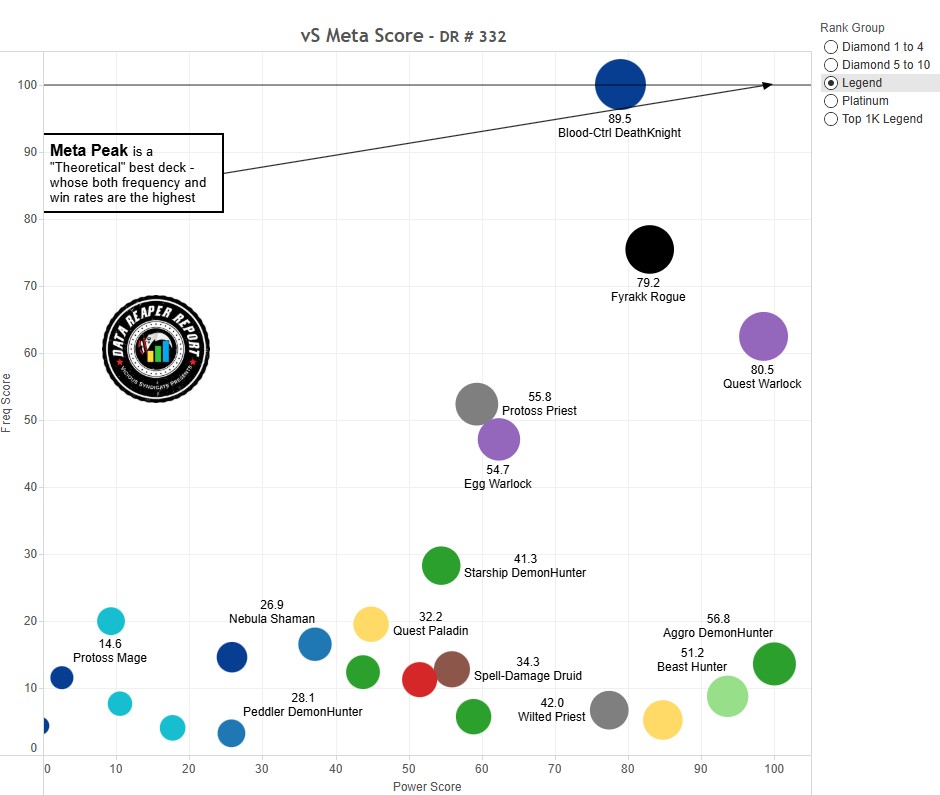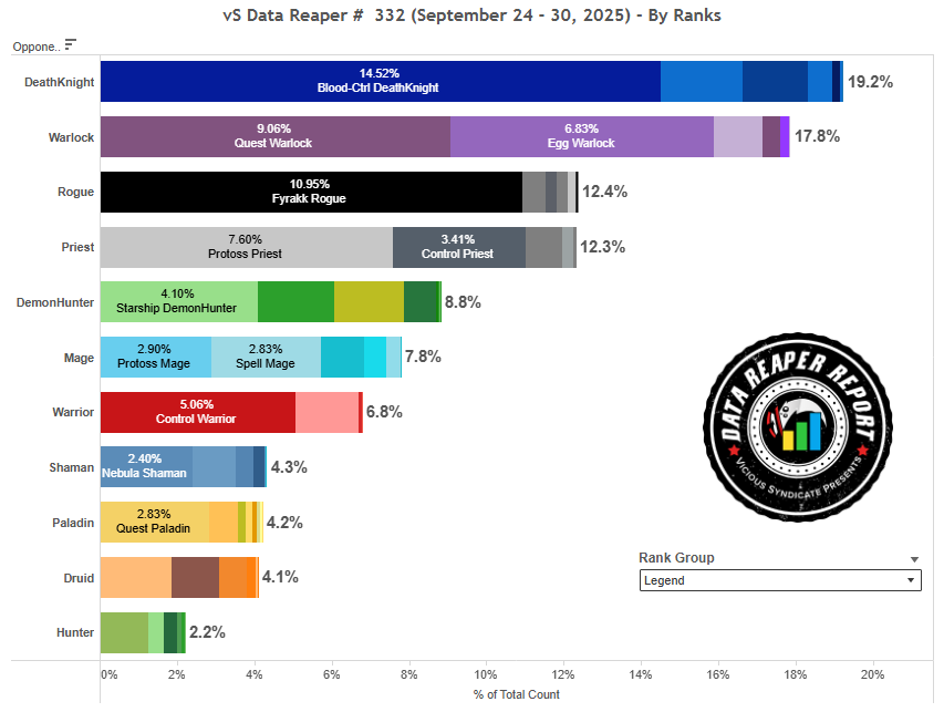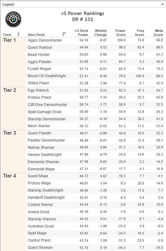 Главная перемена в топе Легенды — это рост числа Чернокнижников, на который влияют и Квест, и Кхелос Лок. Квест Чернокнижник остается более видным представителем класса, в то время как Кхелос Чернокнижник опережает Контроль ДК, занимая теперь 3-ю строчку среди самых популярных колод. Вместе с ростом Чернокнижника на спад идет Рыцарь смерти. Вера в Звездолет ДК тает на глазах.