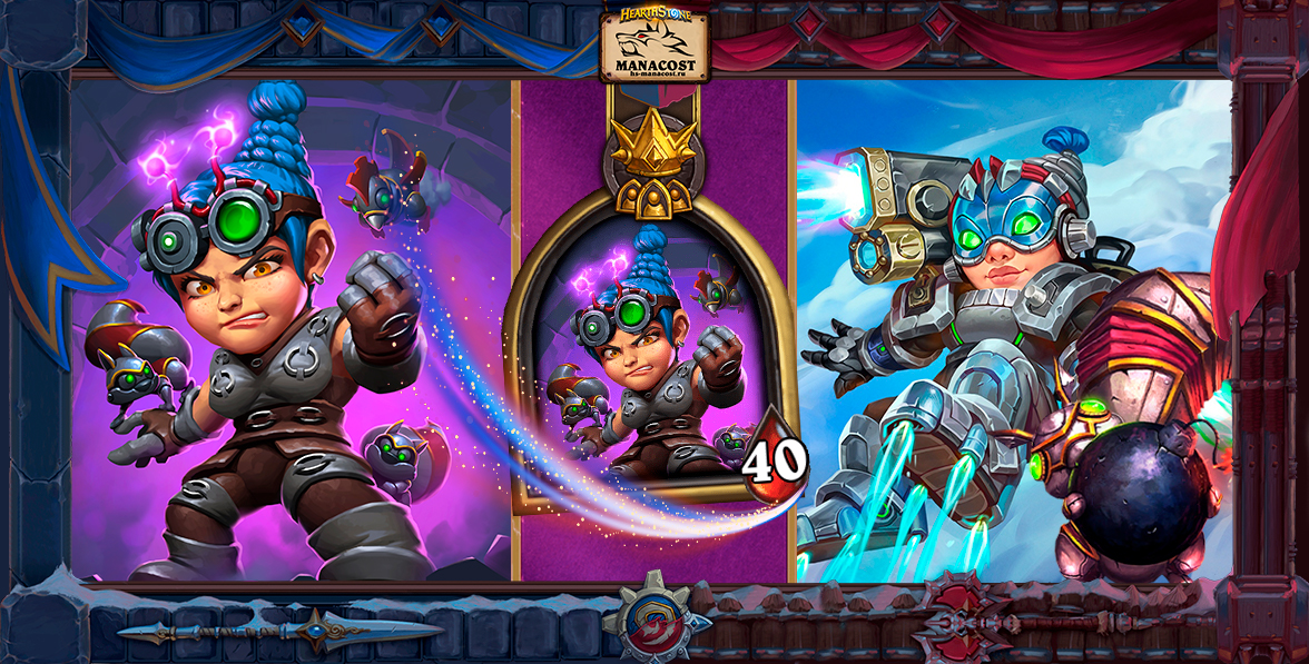 Сила героя Миллифисент Манашторм — одна из самых простых в игре. Все мехи в таверне получают бафф +1/+1. Важно, что этот бафф не получат механизмы, которых вы раскопаете с триплета или сгенерируете другим способном, например с помощью Дорнозму.