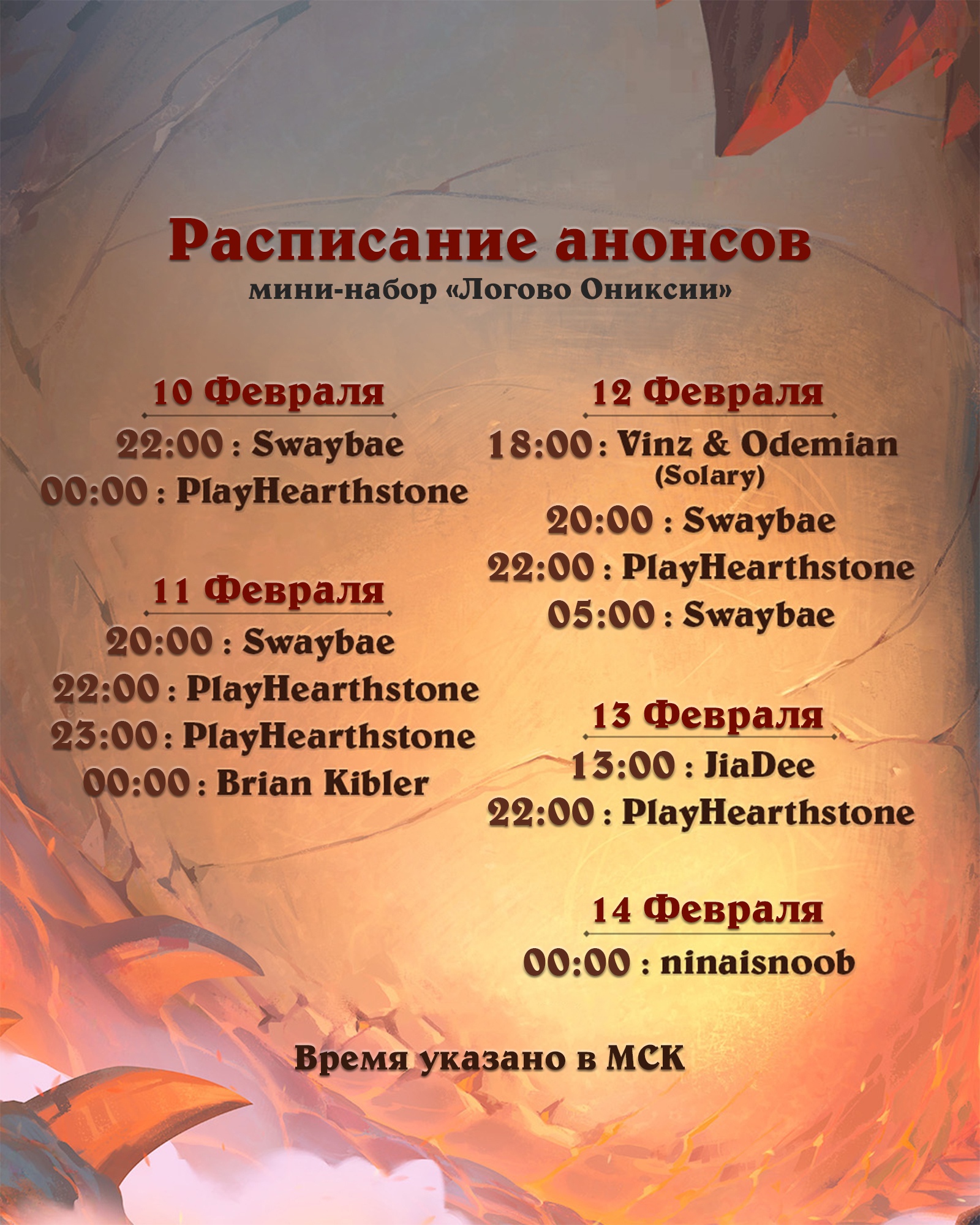 Собирайте группу и готовьте огнеупорное снаряжение, ведь настало время для пламенной кульминации года Грифона — похода в логово Ониксии! Мини-набор «Логово Ониксии» выходит 15 февраля и включает 35 уникальных карт (всего 66 новых карт). Вас ждут драконы и элементы механик, с которыми вы встречались на протяжении всего года Грифона!