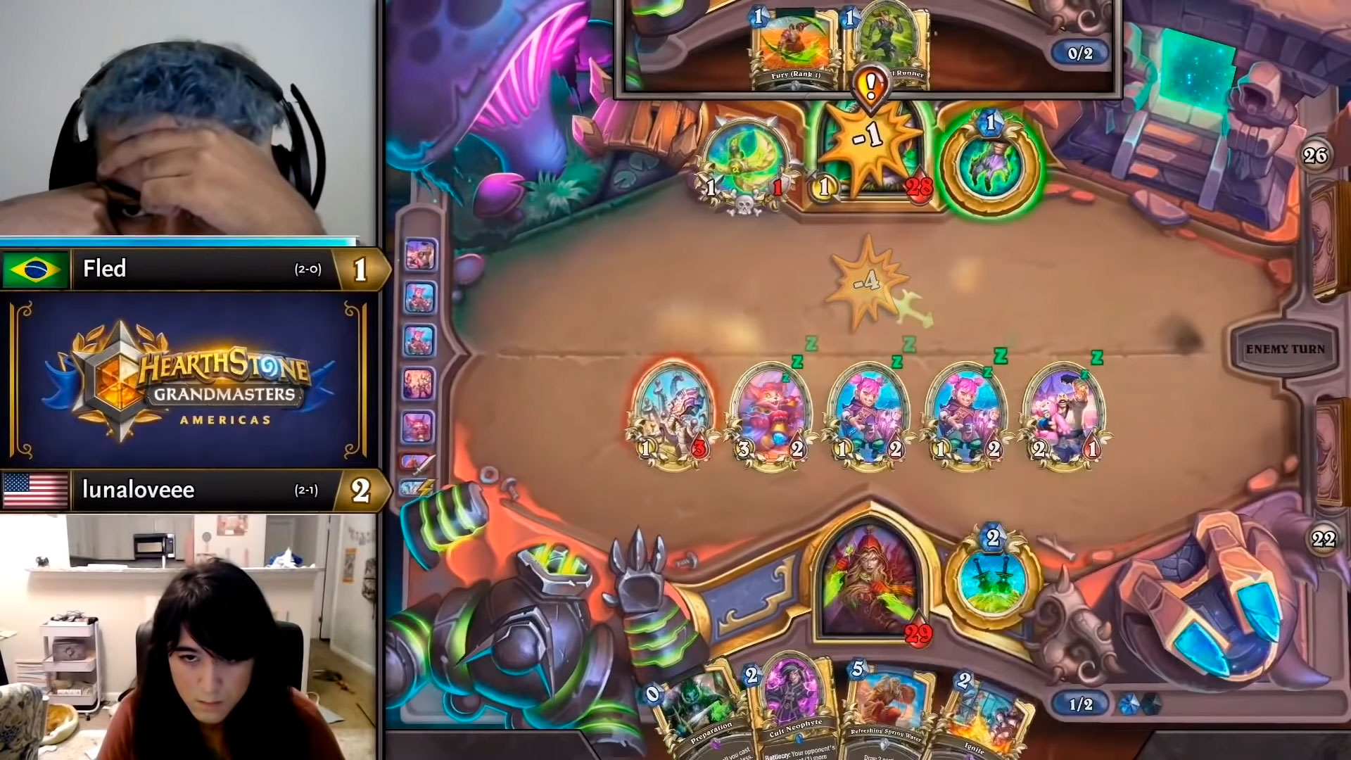 Поскольку Тюремщик душ уже был на столе, Fled приходится самостоятельно активировать осьмибота для минимального числа удешевлений. Благодаря этому luna расширяет свой стол сразу до 5 существ на 2-м ходу, чтобы попытаться убить Иллидана до того, как тот сможет выставить Ожесточенных громил.