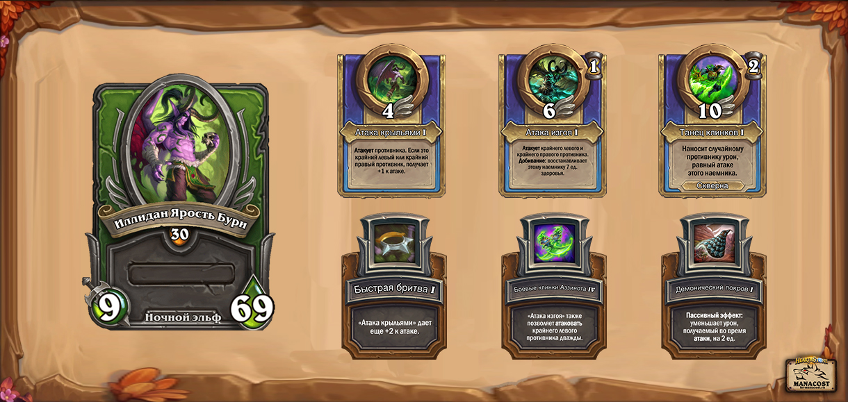 Иллидан относится к расе ночных эльфов, которые ни с чем не синергируют. Было бы куда проще, если бы Иллидан был демоном, потому что тогда его можно было бы брать в отряды с Гул’даном, Джараксусом и другими (пока что они слабые, но могут баффнуть демонов или добавить в игру новых наемников этой расы).