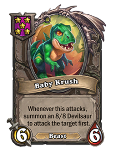 - После: 6 атаки, 6 здоровья. Когда это существо атакует, призывает дьявозавра 8/8. Дьявозавр атакует цель первым.