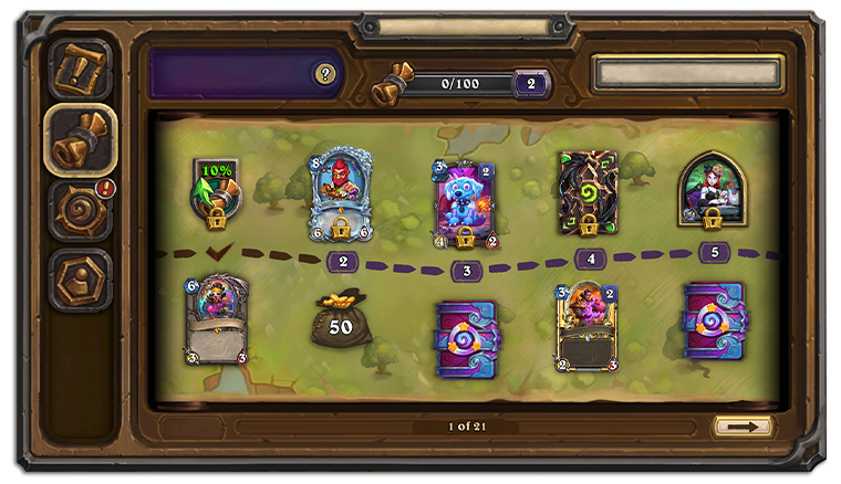 Бесплатная Лента наград «Мастерской Чудастера» включает в себя комплекты карт «Мастерской Чудастера», стандартные комплекты, случайную эпическую карту, две случайные легендарные карты, пропуски в таверну, новую рубашку карт и уйму золота! Кроме того, вы сможете получить 14 золотых карт и легендарную карту нового дополнения «Директор магазина Ли’На»!*