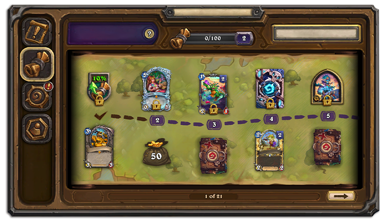 Бесплатная Лента наград «Раздора в тропиках» включает в себя комплекты карт «Раздора в тропиках», стандартные комплекты, случайную эпическую карту, две случайные легендарные карты, пропуски в таверну, новую рубашку карт и уйму золота! Кроме того, вы сможете получить 14 золотых карт и легендарную карту нового дополнения «Горгонзорму»!* За завершение Ленты наград вы получите один из 21 облика на выбор.