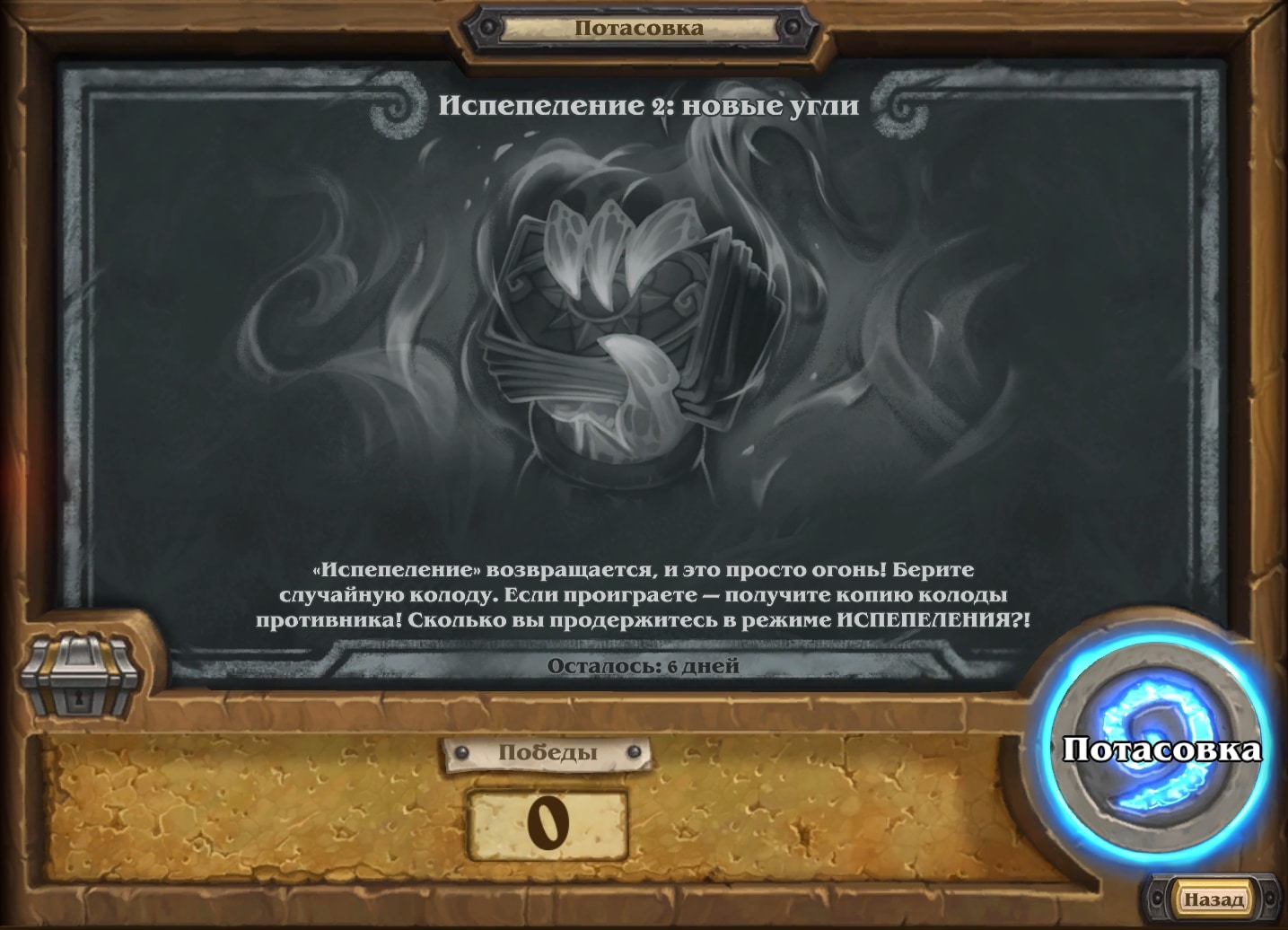 Описание потасовки: «Испепеление» возвращается, и это просто огонь! Берите случайную колоду. Если проиграете — получите копию колоды противника! Сколько вы продержитесь в режиме ИСПЕПЕЛЕНИЯ?!
